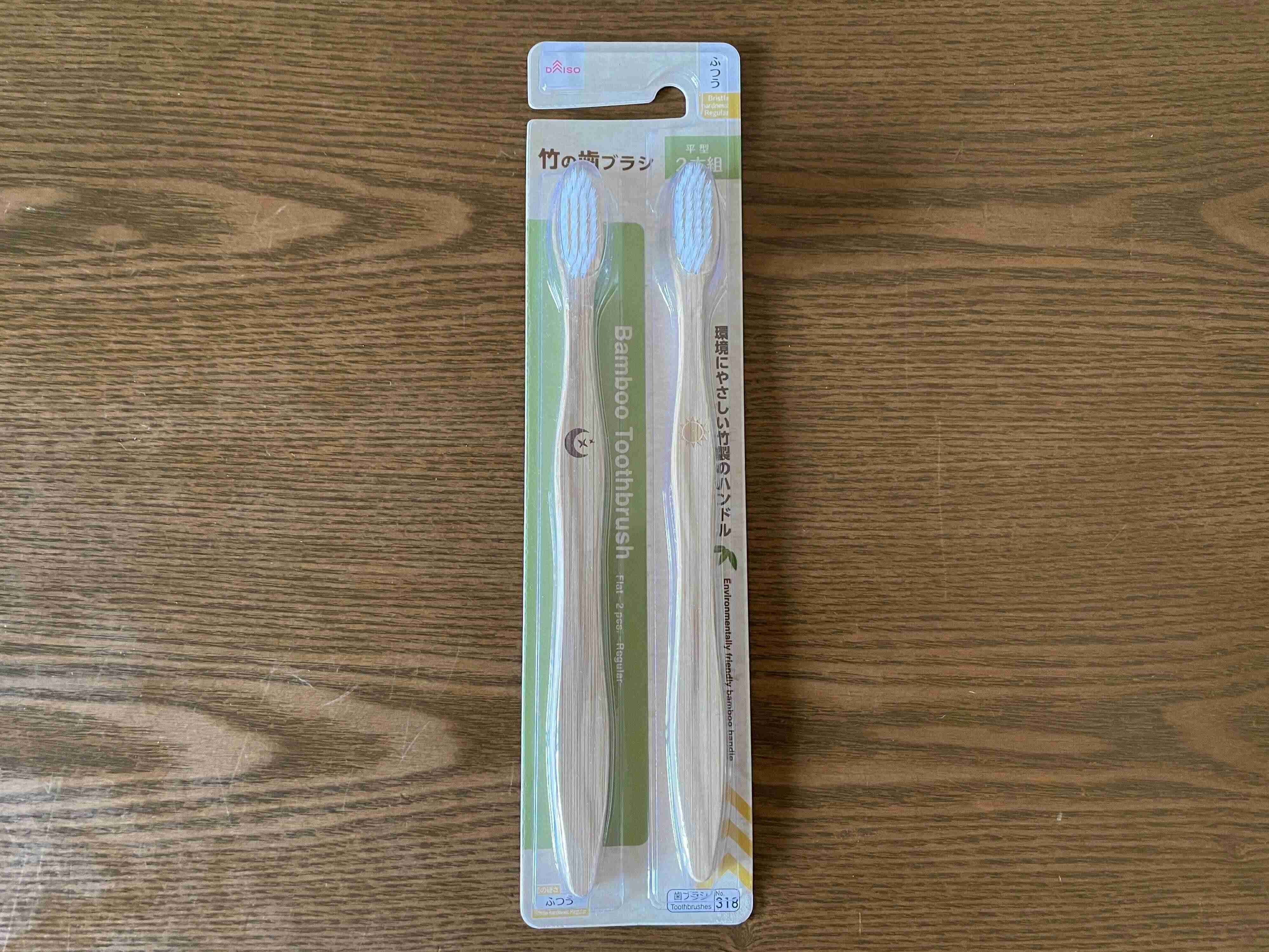 ご紹介するのは、ダイソーの「竹の歯ブラシ」です。2本入りで110円。