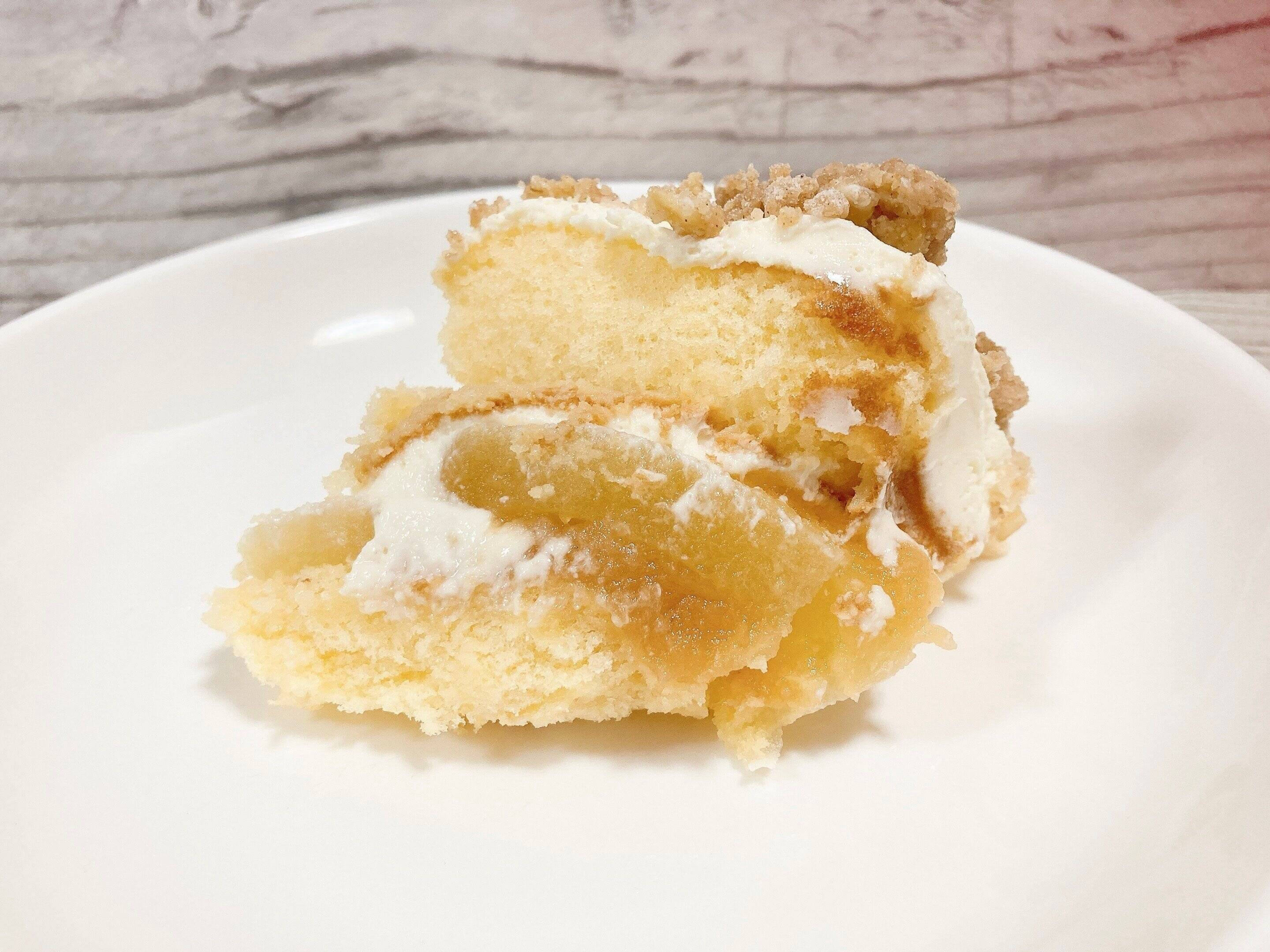 やわらかめの生地なので、スプーンですくってみると表面のクランブルはポロポロしてしまいますが、チーズムースやゴロッと大きめのりんごシロップ漬けが入っていました。