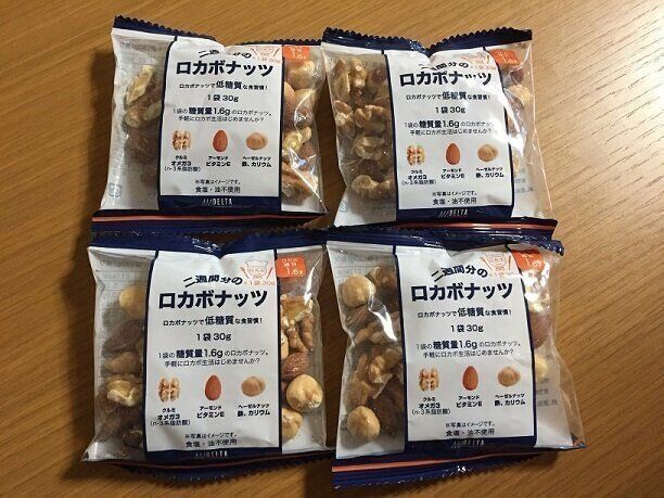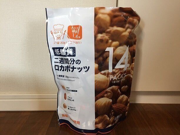ダイエット時のおやつにうれしい「二週間分のロカボナッツ」(購入時:998円)。食塩・油不使用の低糖質のくるみ・アーモンド・ヘーゼルナッツが14袋、1日1袋の食べ切りサイズに小分けされているのが便利です。