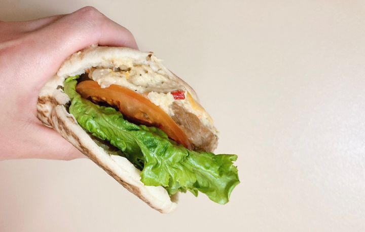 店内でも売られているピタブレッドに、見えていませんがチーズ、クリーミーだけどもったりとしたソース、大豆パティ、トマト、レタスがサンドされていました。