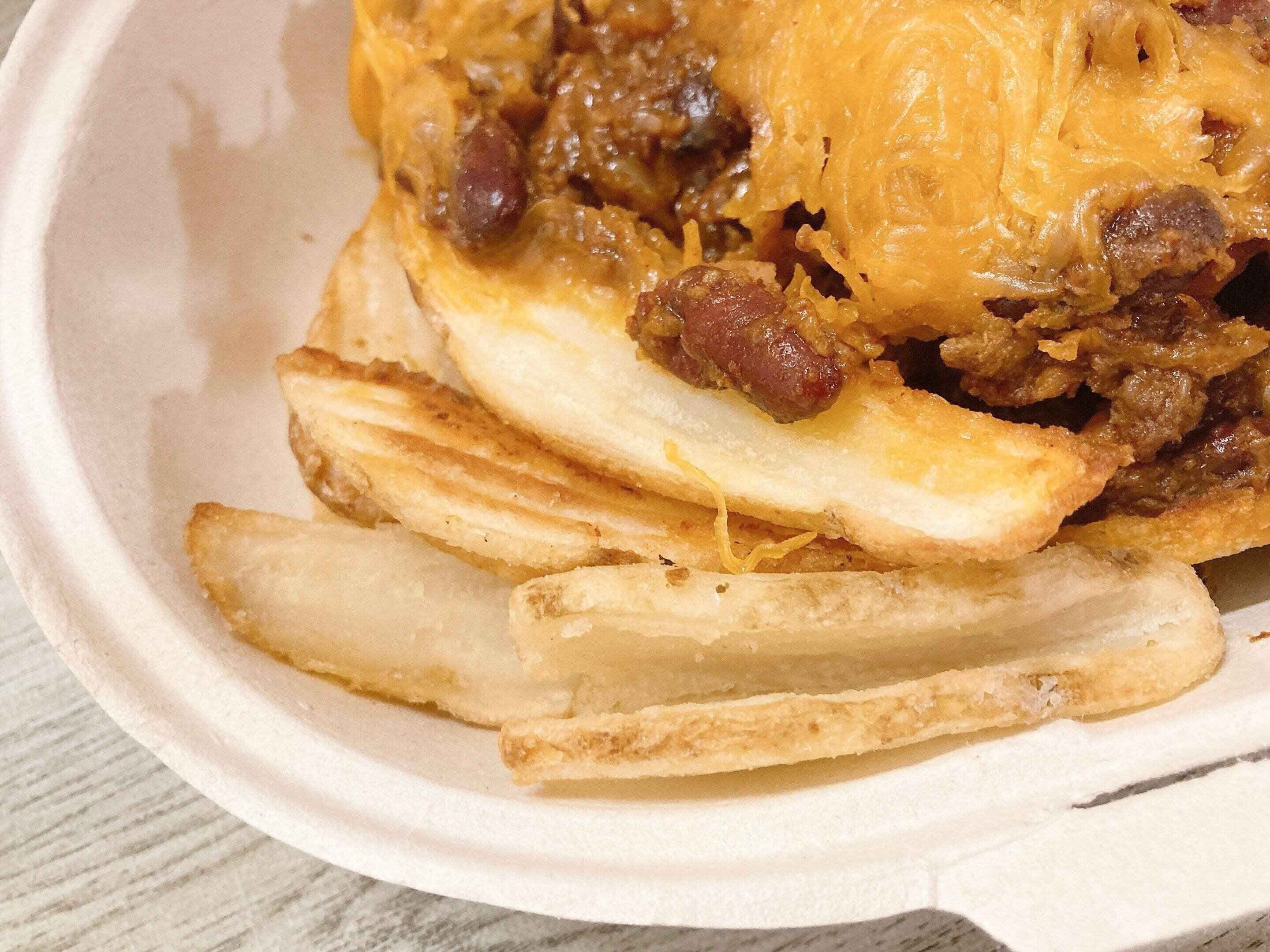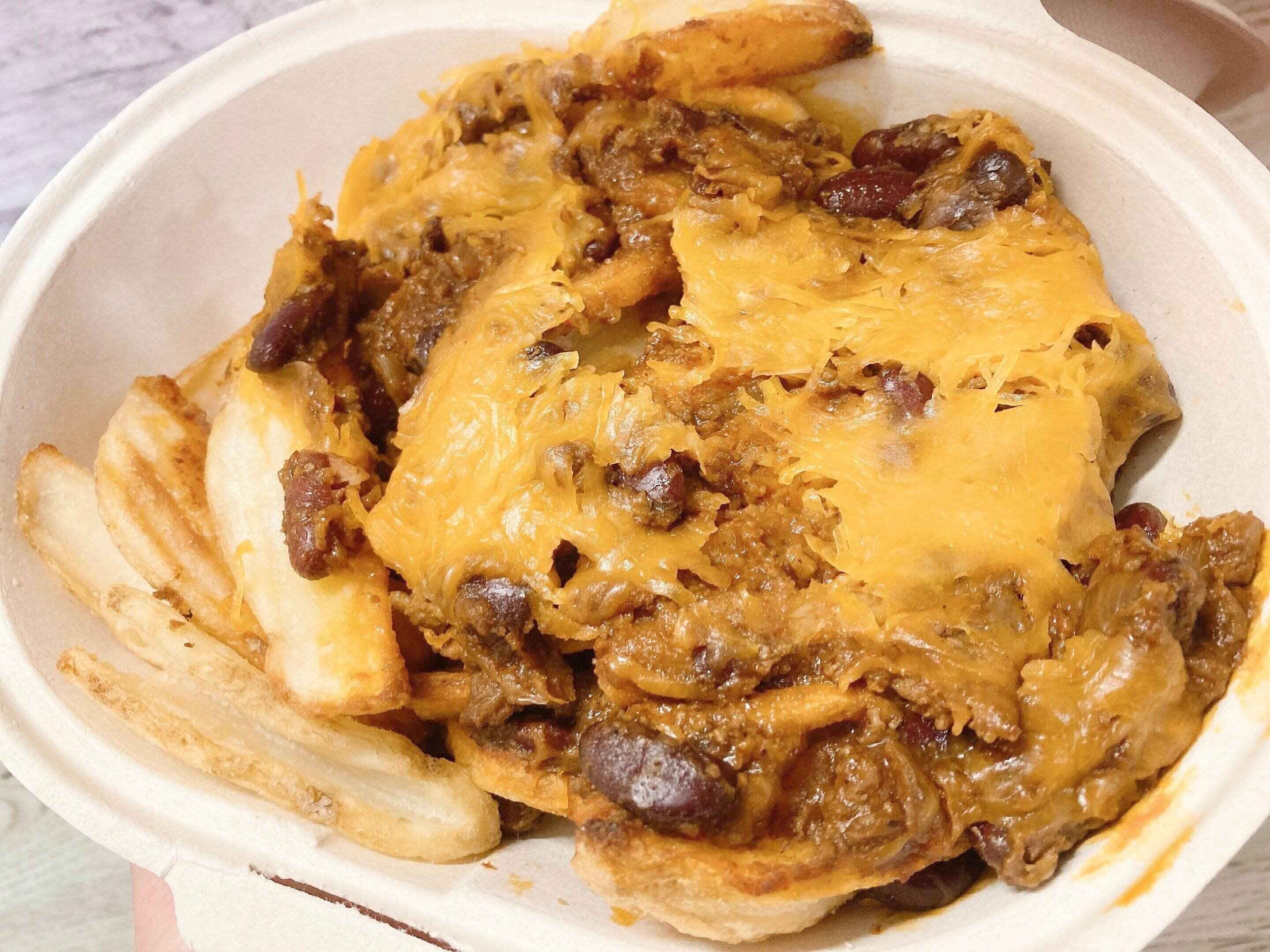 フタつきの容器に入ってわたされたので、開けてみるとV字型のポテトにチリコンカンのような豆とひき肉のソース、たっぷりのチーズがかけられていました。