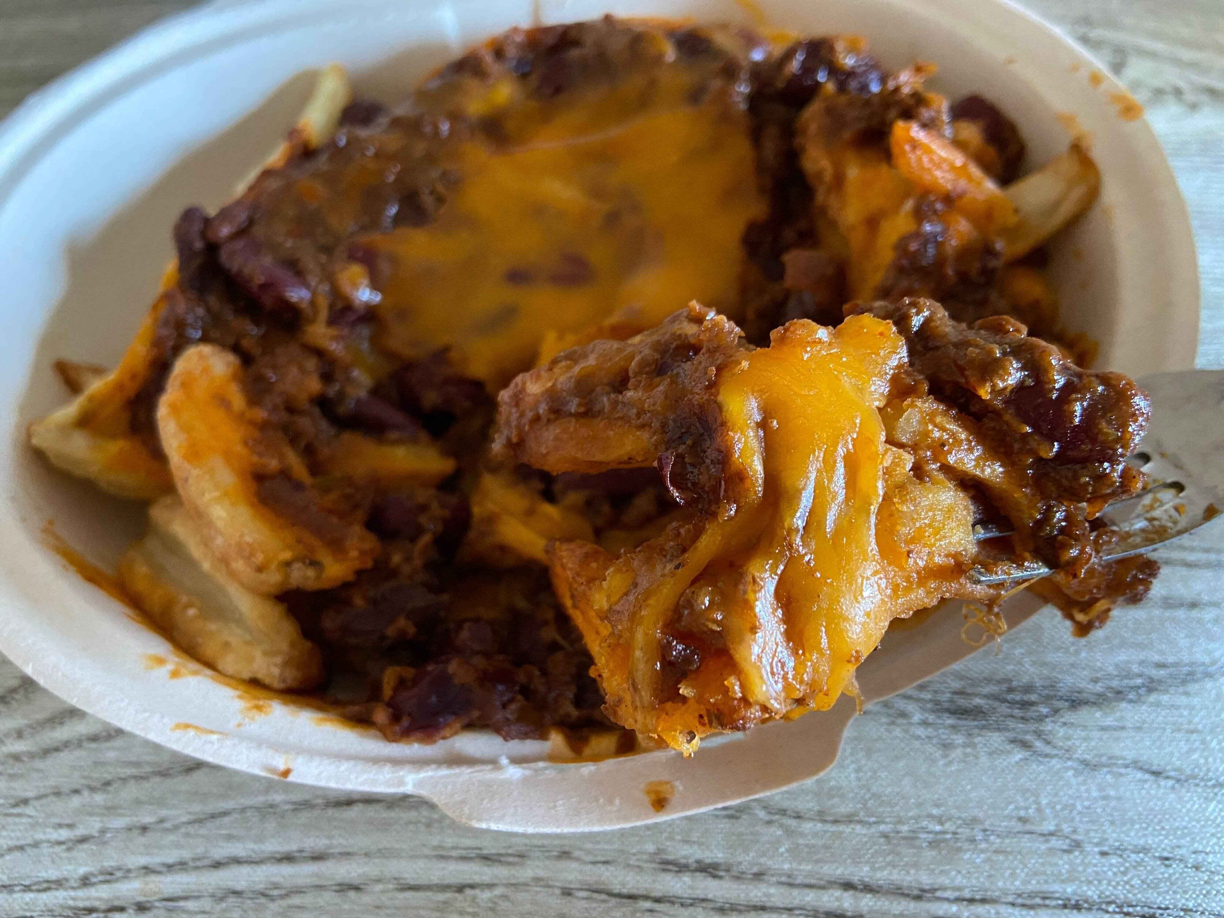 たっぷりのフライドポテトにチリビーンズとチーズがのって、一人では食べ切れないほどのボリューム感。