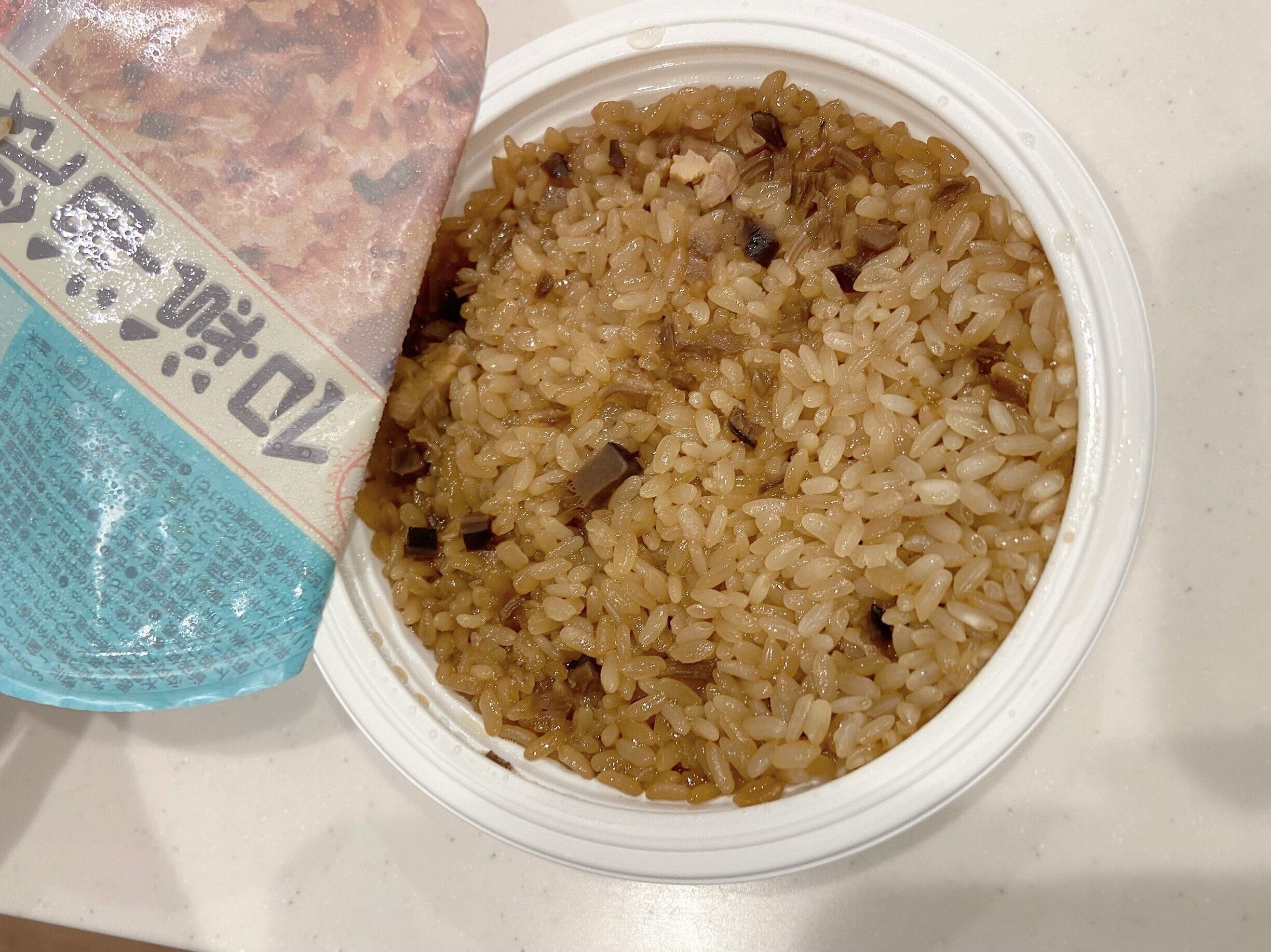 パッケージを開けてみると、ツヤツヤしっかり味付けされたもち米と具材は鶏肉、たけのこ、しいたけが入っています。