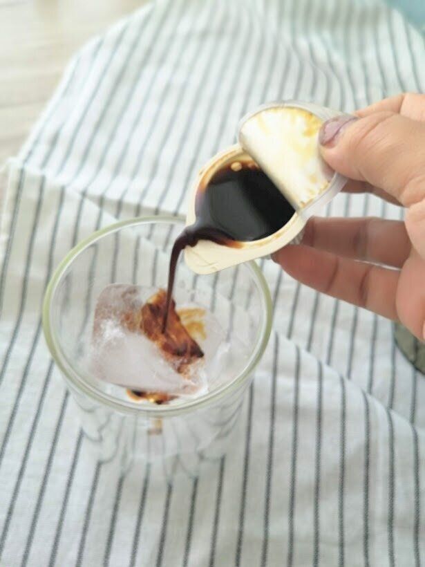 1.グラスに氷を入れ、ポーションをあけて、コーヒー液を注ぎ入れます。無糖なので、わりとサラリとした液体です。