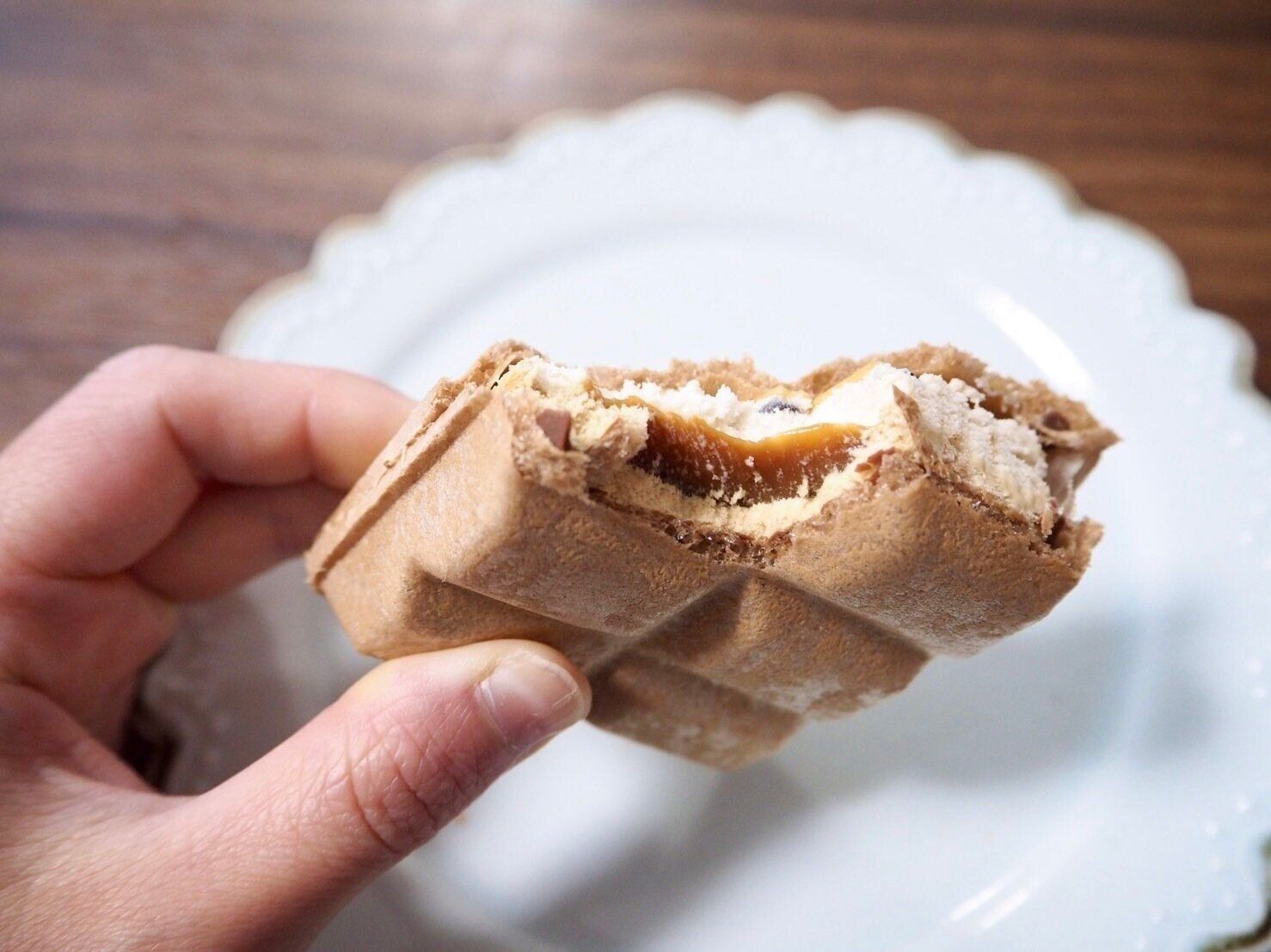 パッケージを見てみると、モナカの中には塩キャラメルのアイスとチョコチップ入りコーヒーミルクアイスが半分ずつ、さらにその真ん中にはキャラメルソース。