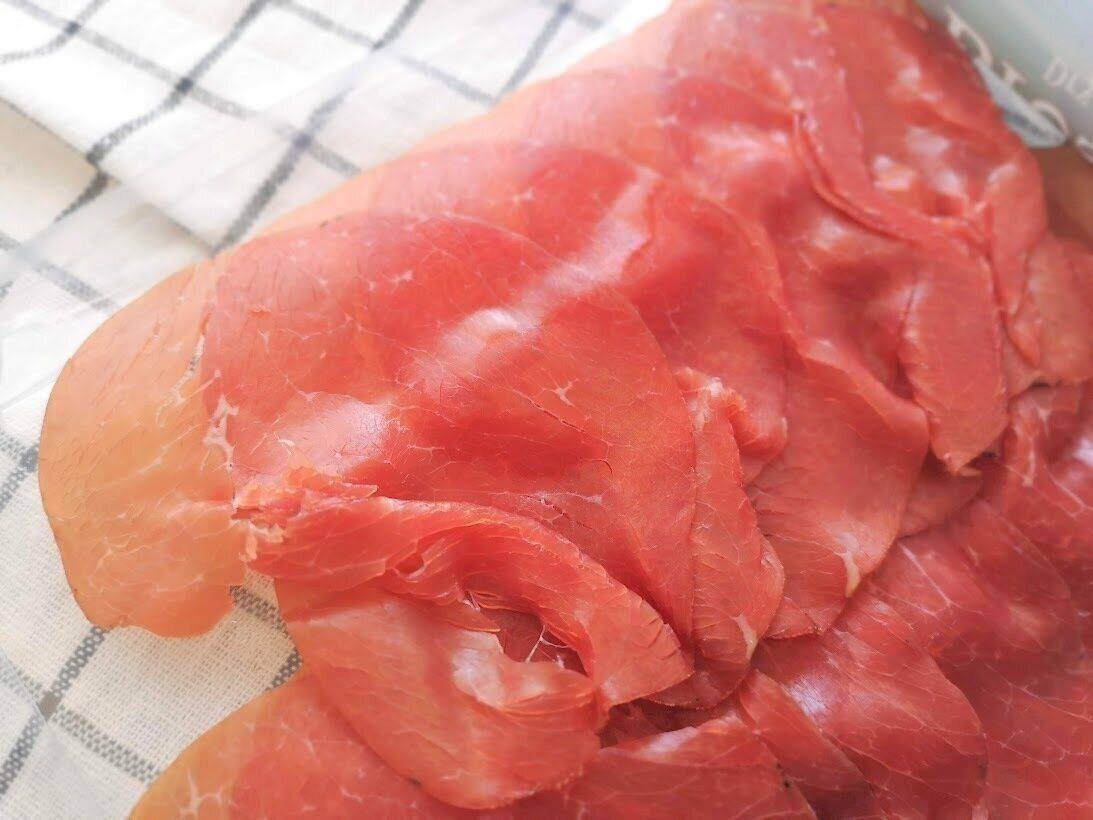 単体ではややクセが強く食べにくい牛肉生ハムですが、サラダにトッピングしたり、サンドイッチの具にしてみたところ、牛肉の旨味が前面にでてきて、とても美味しくいただけました。