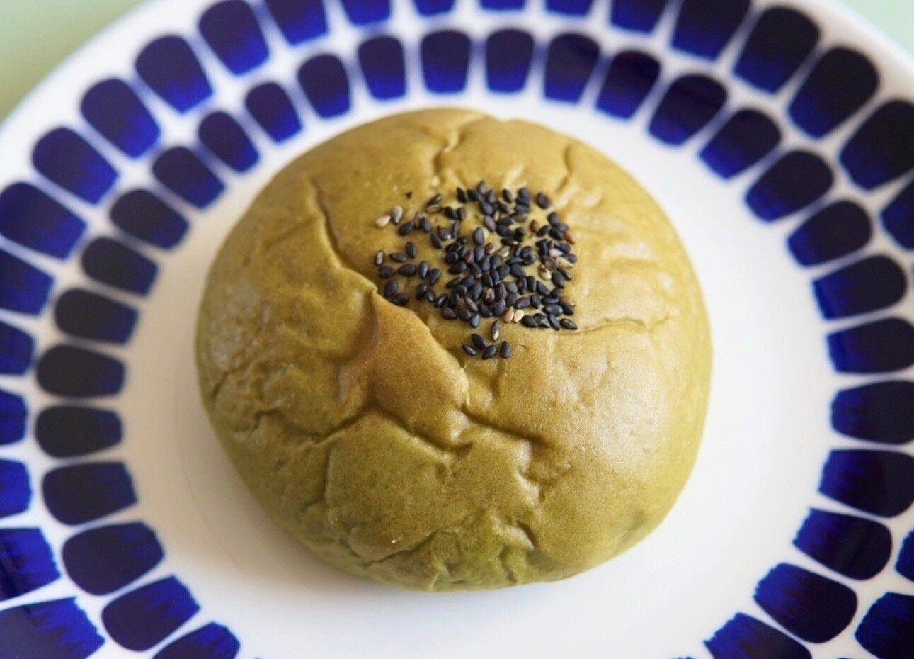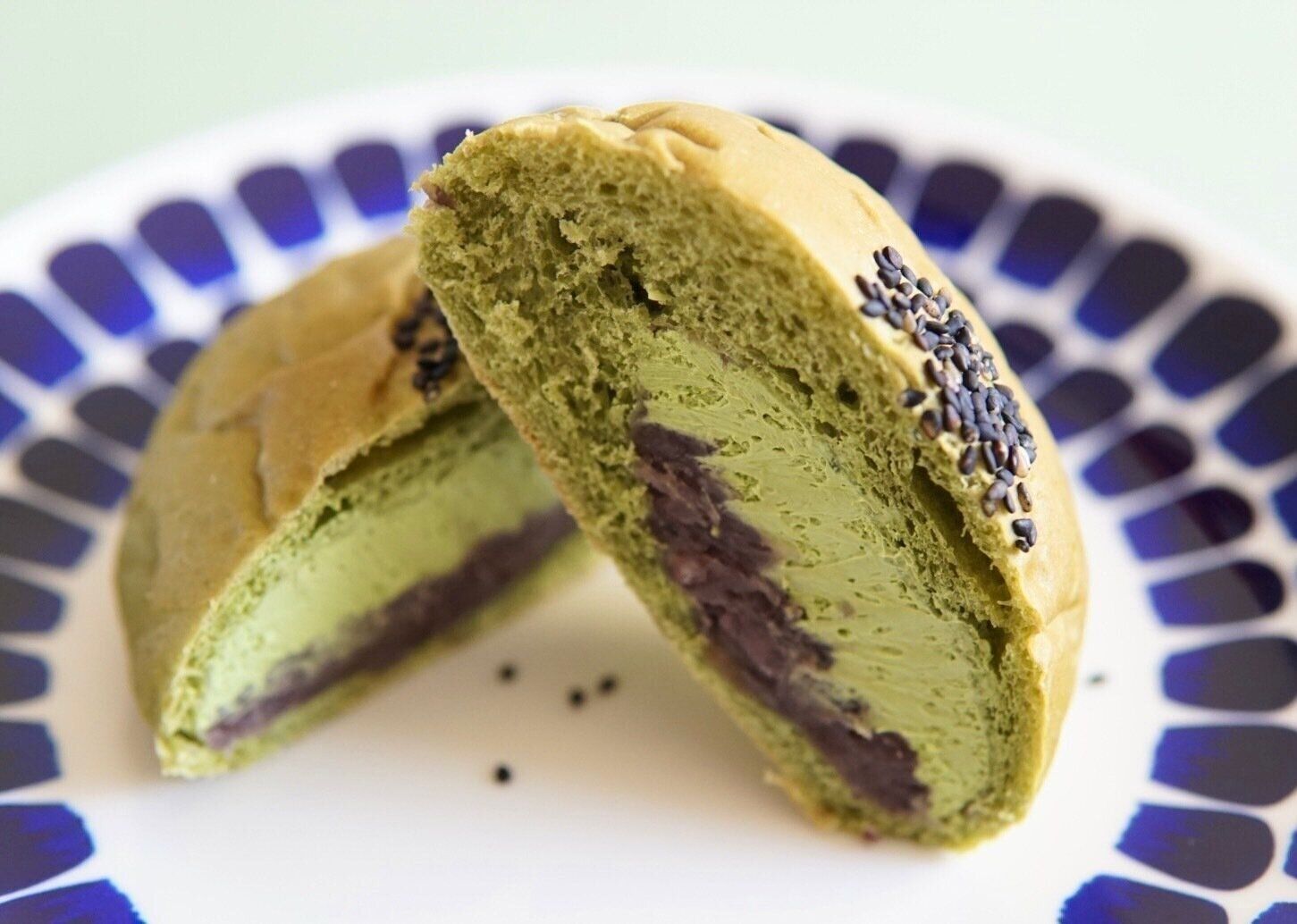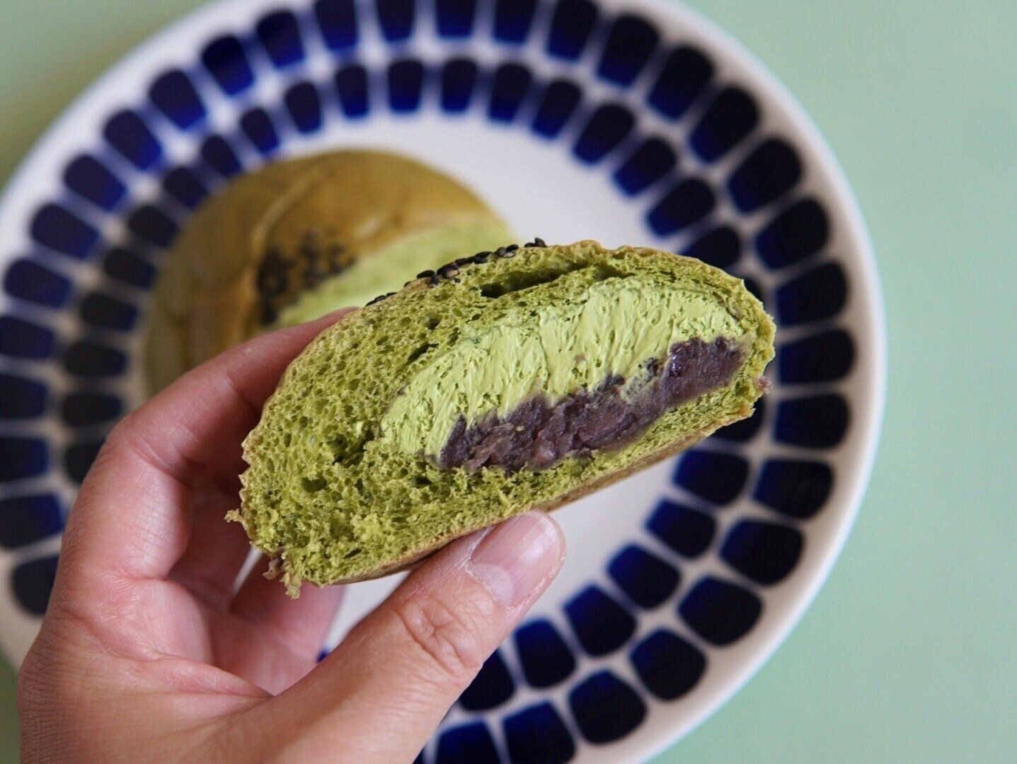 パンとホイップに森半の宇治抹茶が使われています。抹茶を練り込んだ抹茶風味のパンは、中のホイップとあんこをほどよく引き立て、でも主張はしすぎない。ほんのりと抹茶が感じられます。上にのっている黒ごまもほどよい苦みとアクセントで主役を引き立ててくれます。