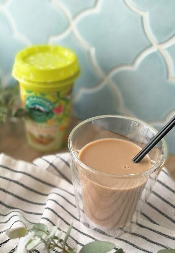 今回のマウントレーニアは「ハッピーピスタチオ」という商品なので、なんとなくイメージ的に色合いもグリーンなのかしら?と気になり、カップに注いで見ましたが色合いは普通のカフェオレ色でした。