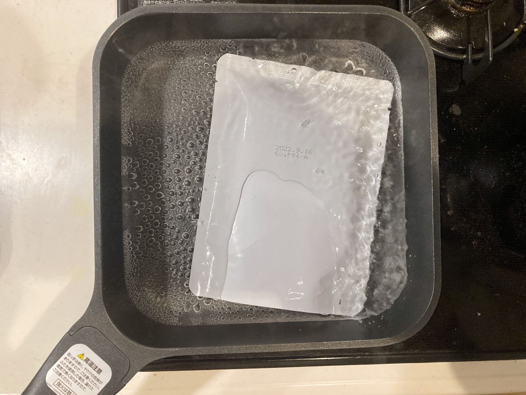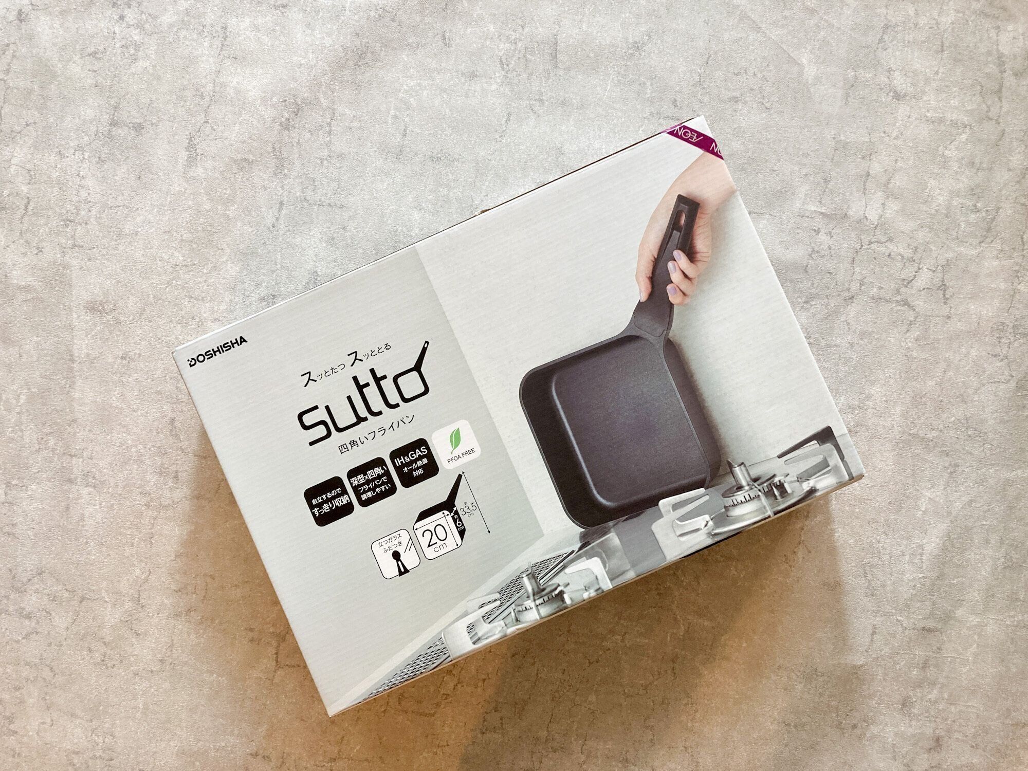 ネットで気になっていた四角いフライパン「sutto(スット)」。近所のスーパーでも売ってました。ネットではグレーのカラーも販売していましたが、揚げ物メインで焦げ付きも気になるのでオールブラックに。四角いフライパンの特徴はこちらです。