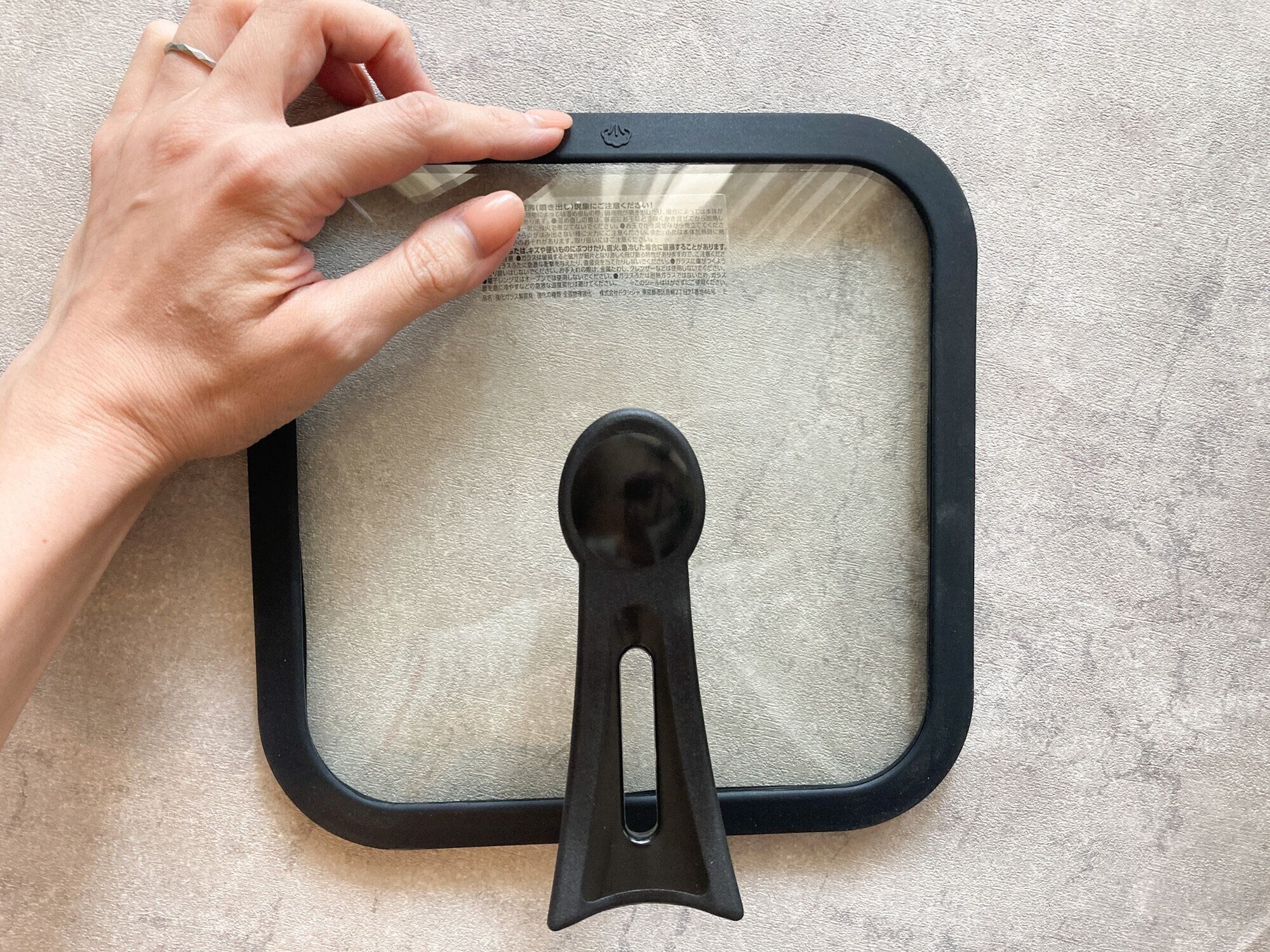 購入したのは、一番大きな20cmのサイズです。ガラス製のフタがセットになっていて、自分で取っ手を付ける仕様になってました。フタにある蒸気口からまっすぐになるように取っ手をセットします。