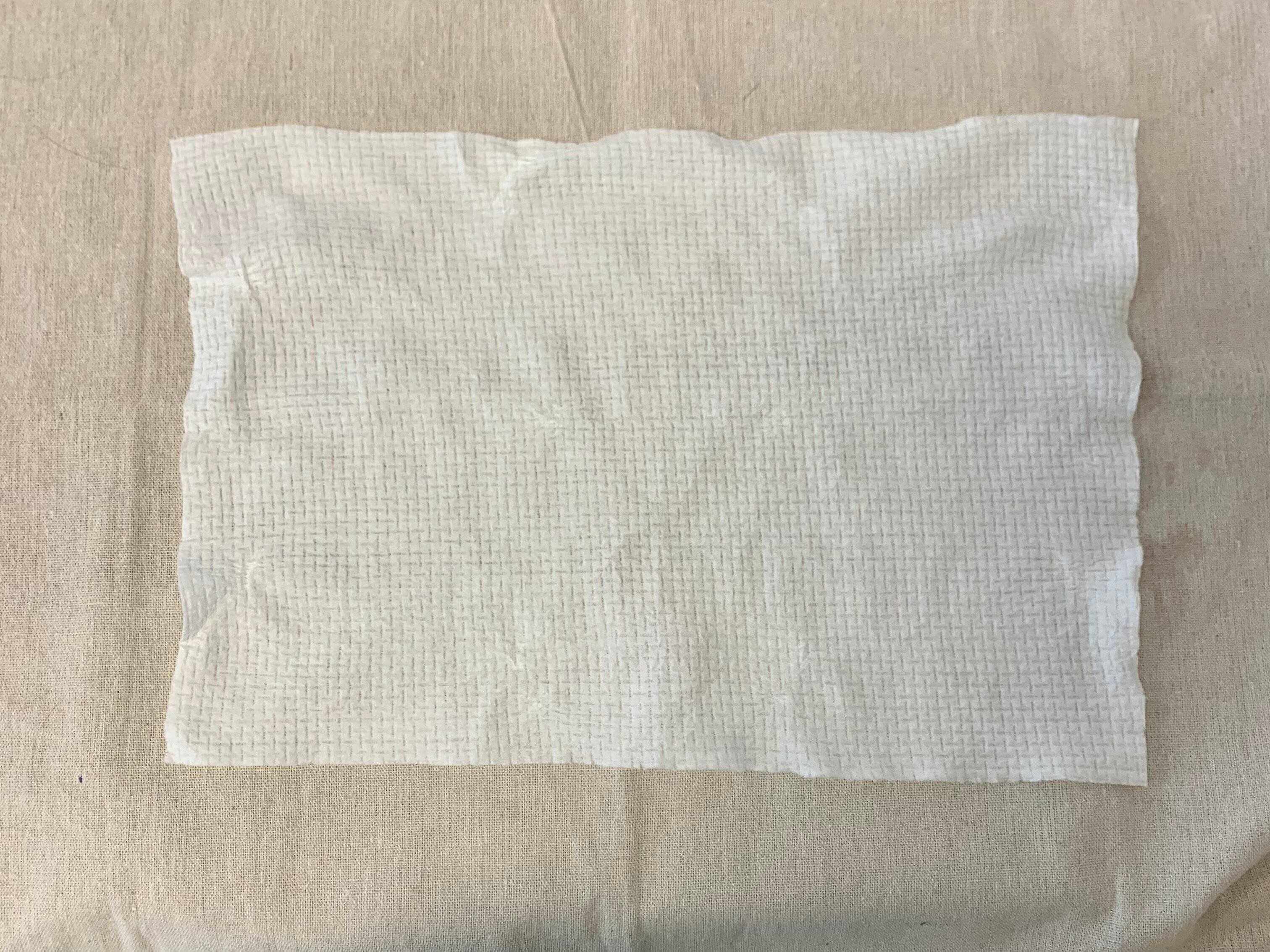 実際に開いてみるとこの様な感じ。23cm×35cmと大判のタオルになります。素材がパルプ100%のため、普通のタオルも比べるとかなり薄手ですが、簡単には破れません。一度、ガシガシと手洗いをしてみましたが、破れませんでした。