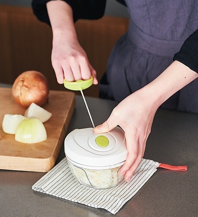 大きめに切った野菜を入れ、ハンドルを数回引くだけで面倒なみじん切りが即完。玉ねぎを切っても目が痛くならないし、パーツが少ないから洗うのがラクなところも推し。買わない理由はないです(13×13×9cm)。──マナティさん