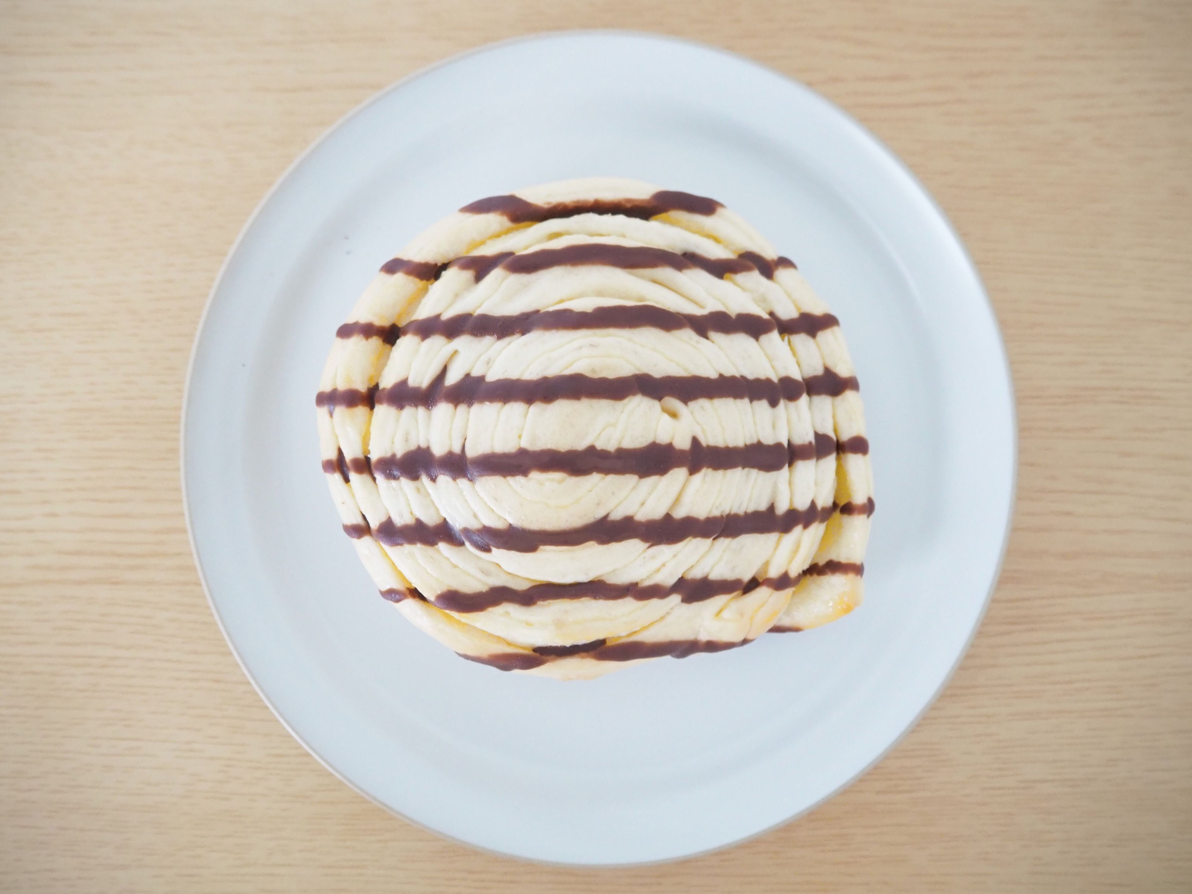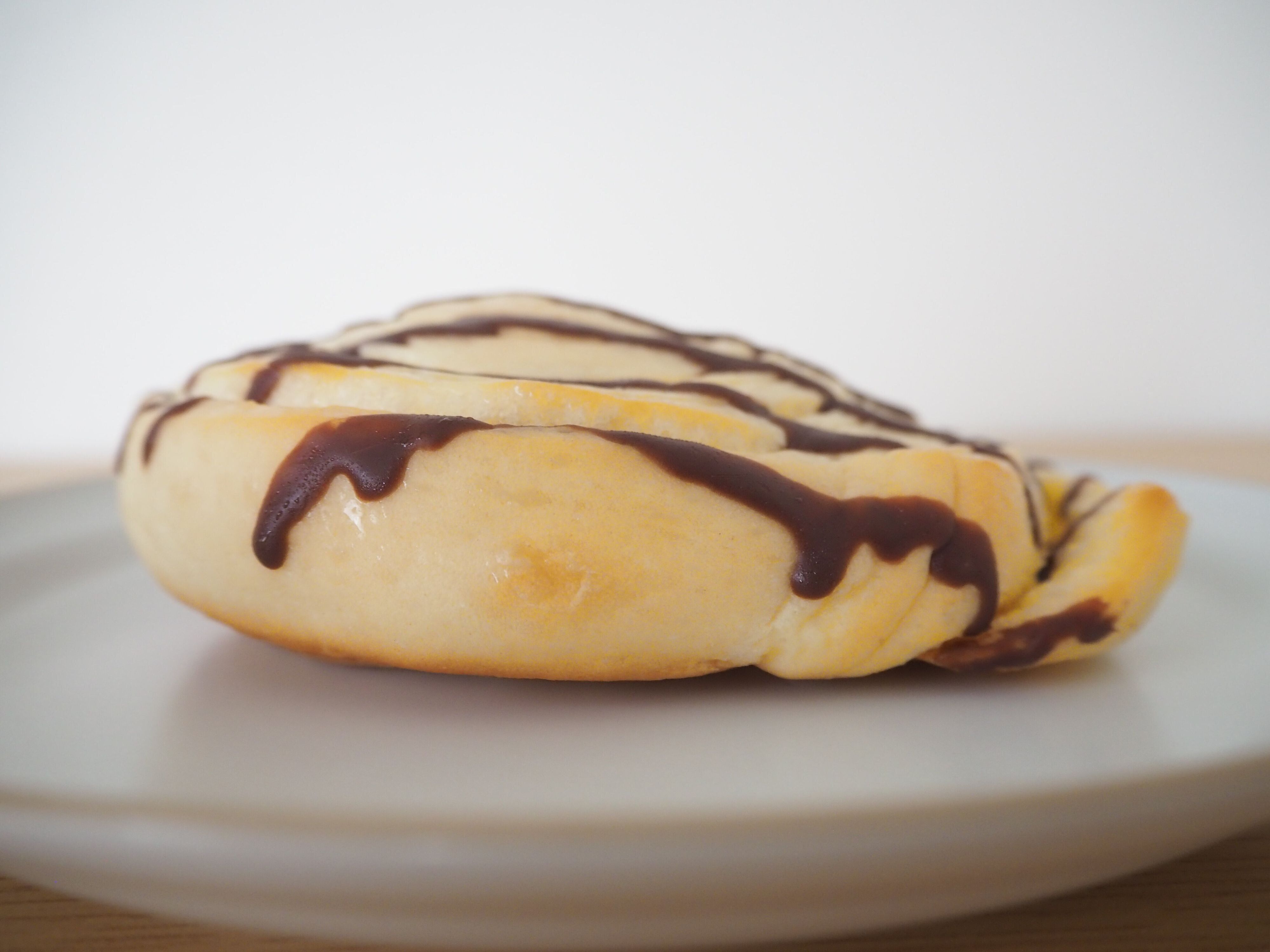 開封して、お皿に移してみました。上から見ると、渦を巻いていることがわかります。表面にかけられたチョコレートが、どことなくおしゃれな雰囲気ですね。
