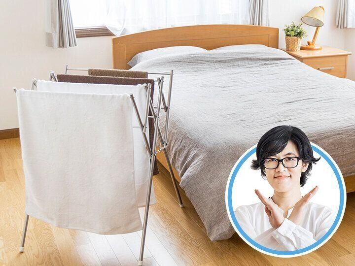 梅雨の時期、外に洗濯物が干せないので部屋干しで…という家庭も多いと思います。また、就寝中の乾燥対策も兼ねて、寝室に洗濯物を干している方もいるでしょう。でも、これは絶対NG! 洗濯物から出た水分が室内の湿度を上げ、それをふとんが吸収。ダニが繁殖する好条件を作り出してしまいます。