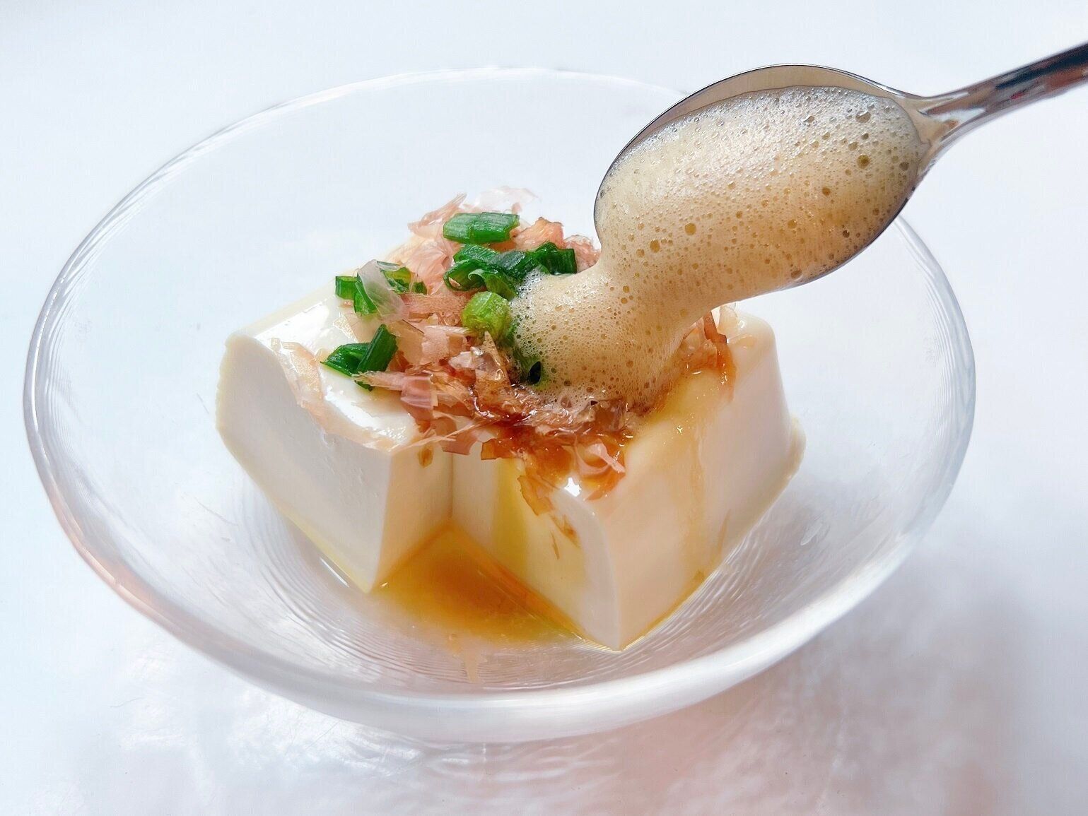 本体カップに少量のお湯を入れ、ゼラチンを溶きます。醤油を入れてからポンプを約2分間上下に動かし泡立てると泡醤油が出来ます。お豆腐やお寿司、卵かけご飯に乗せるとおしゃれにも見えるし、うっかりかけ過ぎてしまうということも防げます。