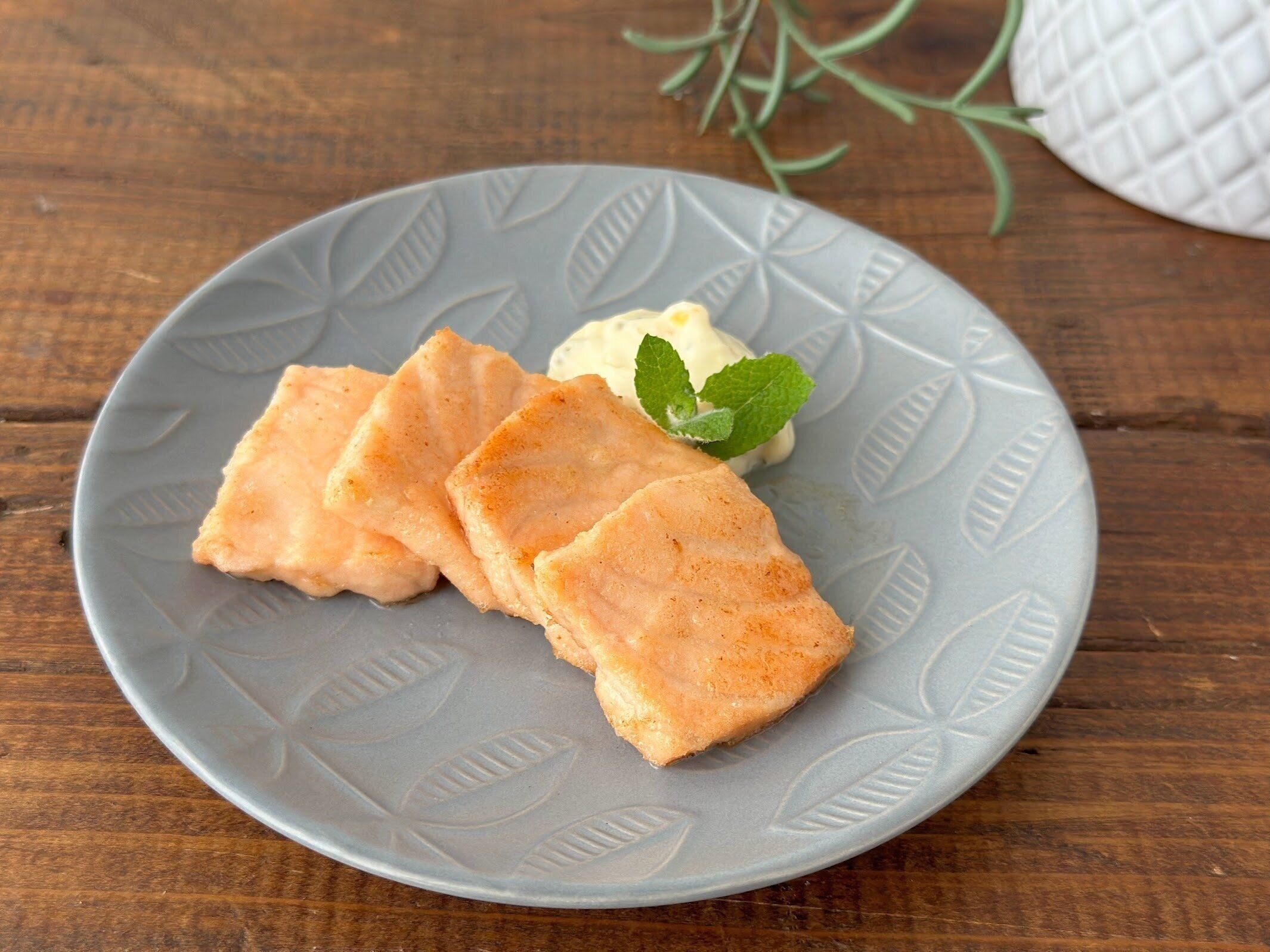 バターを引いたフライパンで、こんがり焼きめがつくまで焼き上げれば、サーモンムニエルの完成!ポイントは、お刺身でも食べられるサーモンなので、さっと表面に焼色が付く程度しか焼かないほうが、ジューシーさを更に味わえるのでおすすめです。