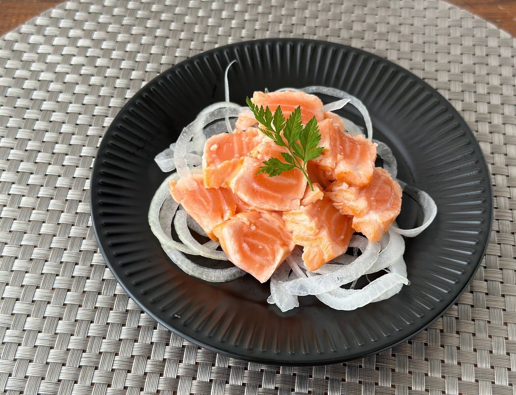 サーモンは1cmほどの大きさにカット、玉ねぎはみじん切りにします。