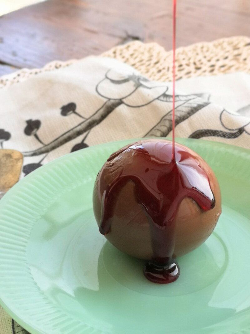 牧家の丸い風船プリン、限定フレーバーの「デビルズチョコレートプリン」です。