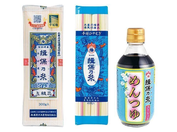 (左から)「手延そうめん 揖保乃糸 上級品」(300g)¥432、「手延ひやむぎ 揖保乃糸」(400g)¥496、「揖保乃糸 めんつゆ ストレート」(300㎖)¥334(すべて税込み)