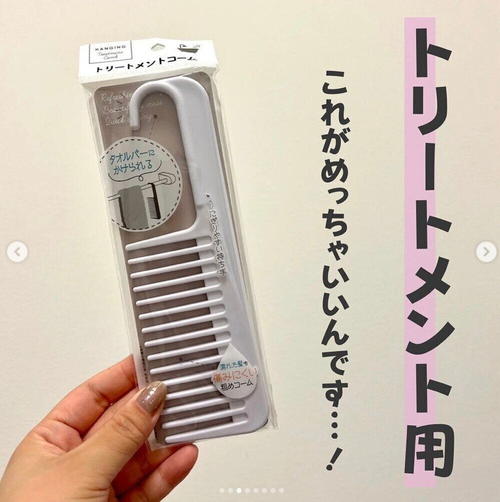 普通のコームより隙間が荒めのこちらのコーム、実はお風呂で使う[「トリートメントコーム」です。濡れた髪はデリケートなので目の細かいブラシだと髪に負担がかかってしまいますが、こちらはちょうどいい荒さで、髪への負担も少なくなじませることができます。そしてコームの後ろにはタオルバーにかけておけるフック付き!水切りしやすい構造です。とてもよく考えられていますね!