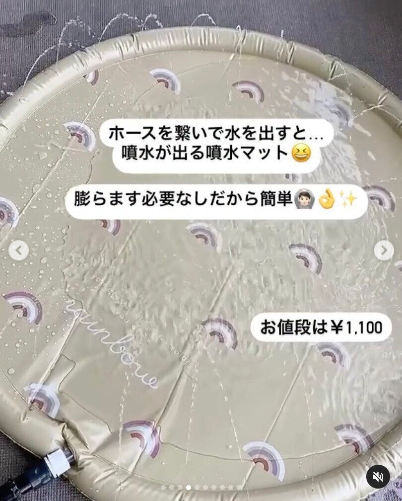 SNSでバズり中の「噴水マット」!膨らます必要がないので、実はプールよりも準備が簡単です。ホースを繋ぐだけでおうちで噴水が楽しめます。準備が簡単なのに子どもも楽しめるし、子どもっぽすぎないデザインで映える!価格は1,100円です。