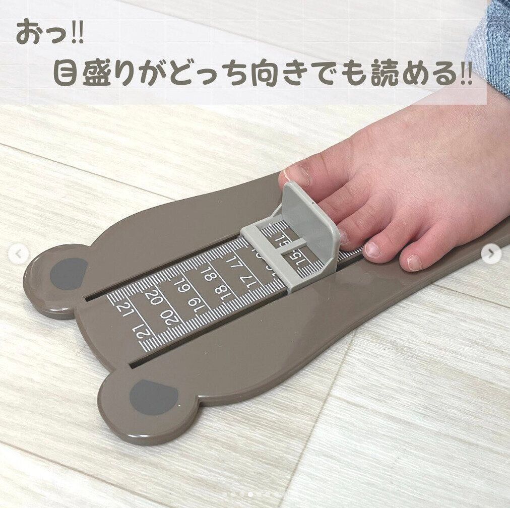 こちらもインスタで話題、子どもの足のサイズが簡単に測れる「フットスケール」です。両方向から読める目盛りがとても便利!クマの形がかわいいですね。足の幅を測るのに使える、柔らか素材のテープスケールもついています。こんなに高機能で価格は330円です。