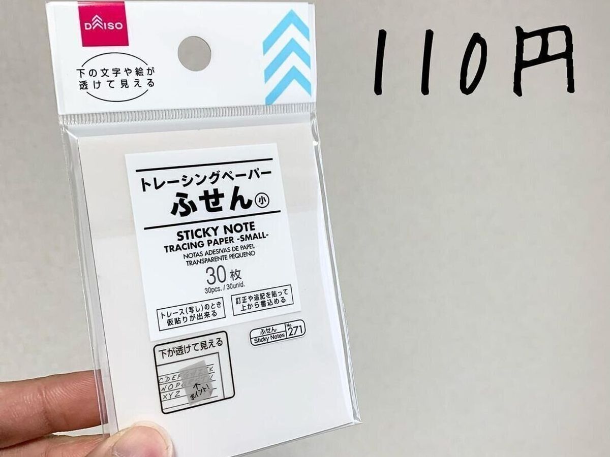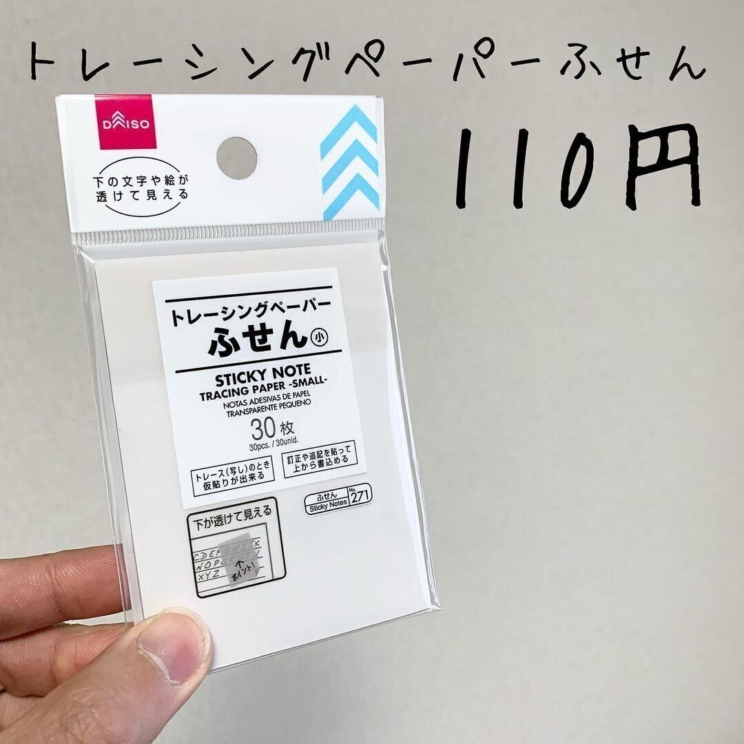 一見するとただの透明の紙ですが、じつはふせんとして大活躍するのです。本や参考書を読んでいるとき、重要部分をふせんで貼ったり、そのまま書き込みしたいときってありませんか?こちらのトレーシングふせんを使えば、ふせんで邪魔になることもありませんし、自由に書き込みも可能!ストレスフリーな読書、勉強を実現しました。ダイソーから販売されているので、ぜひ探してみてくださいね。