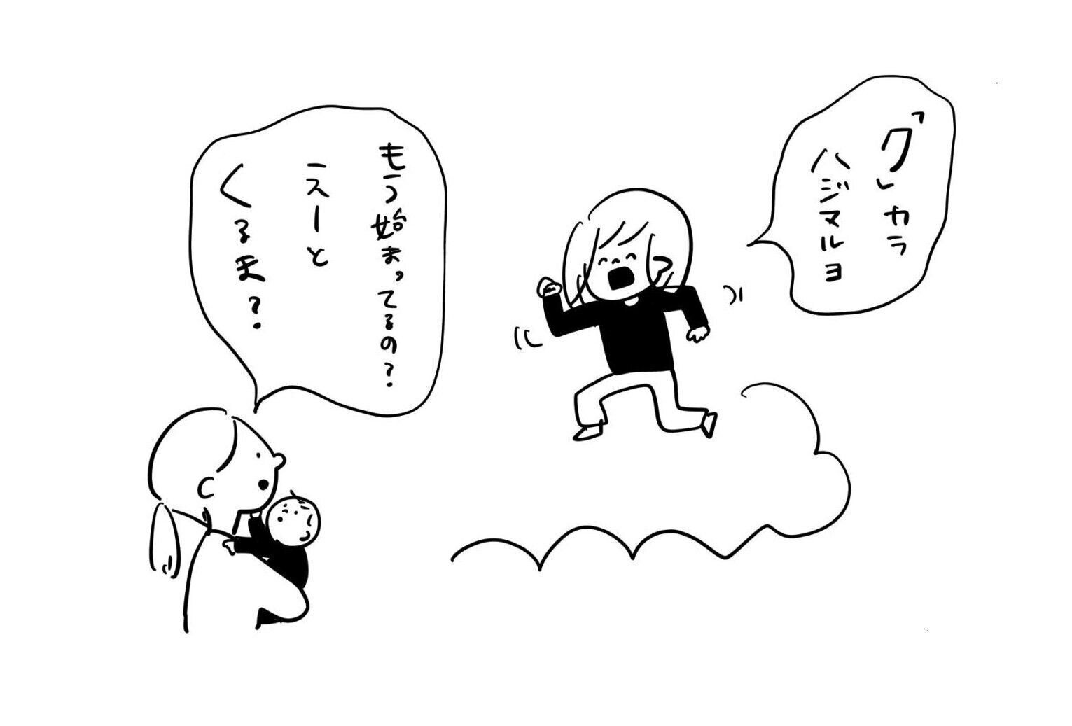 ある日4歳の娘さんがむぴーさんにジェスチャーゲームをしようと提案します。問題を出すのは娘さん、答えるのはむぴーさんです。最初のお題は「く」のつく言葉。