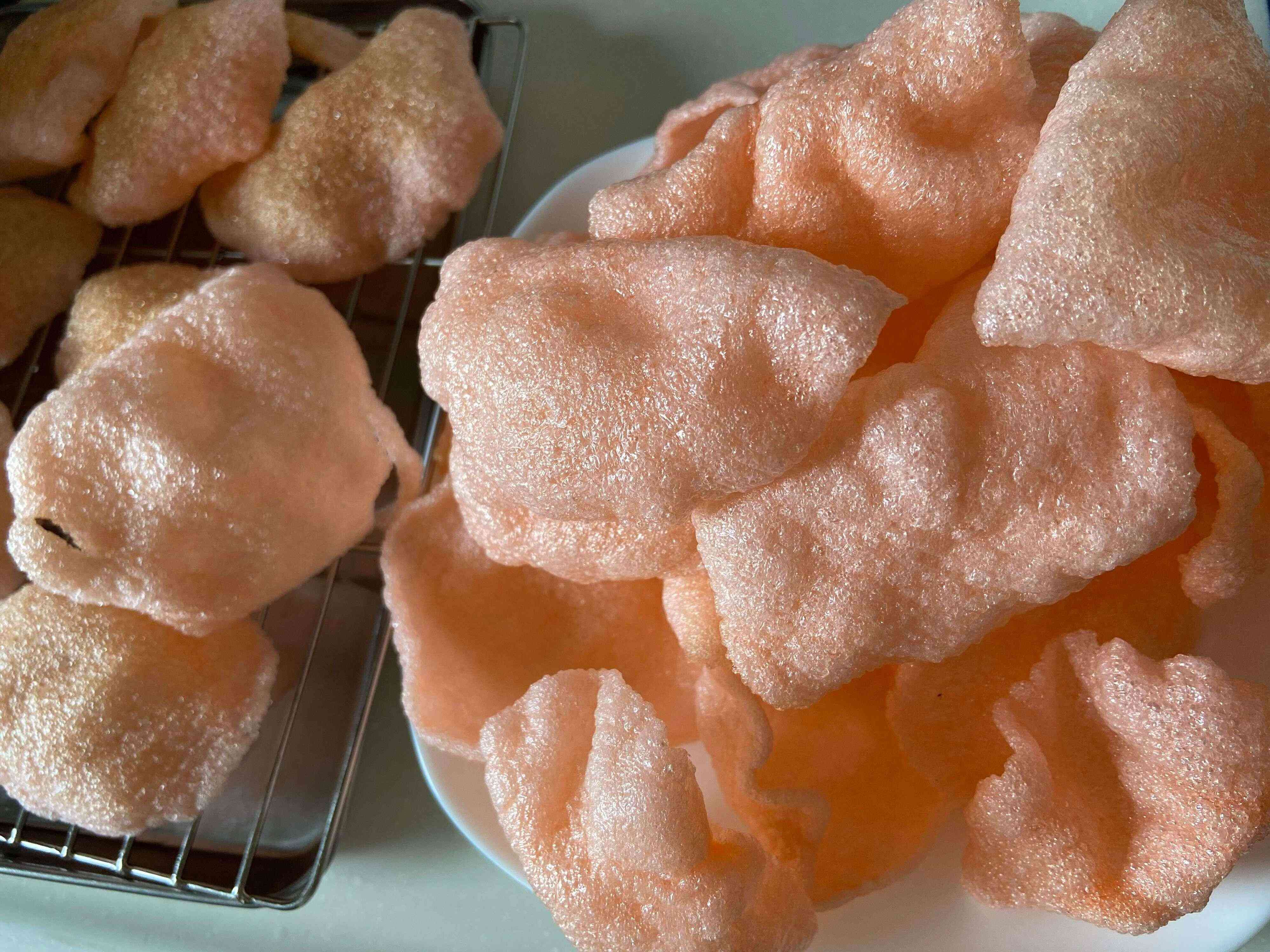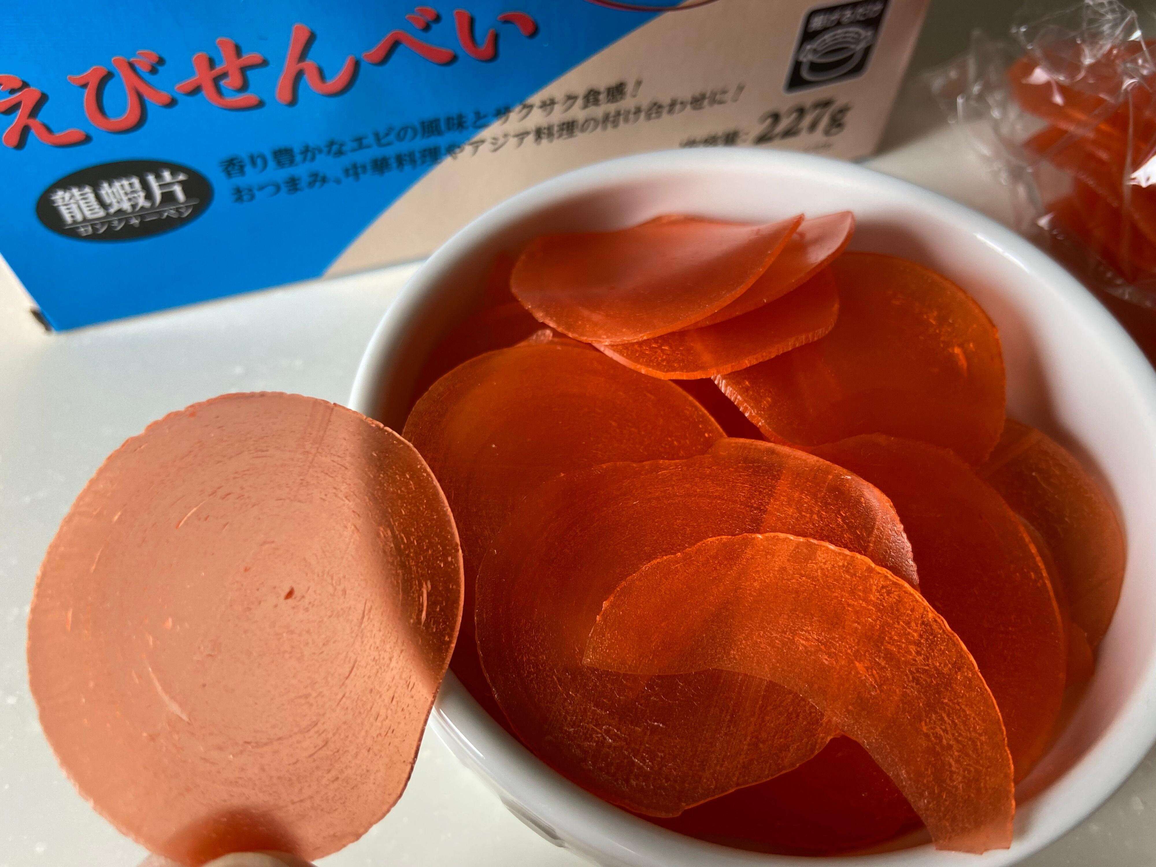 中国料理のエビチリや北京ダックなどの付け合わせとして使われるえびせんべい、中国では龍蝦片(ロンシャーペン)と呼ばれているとのこと。