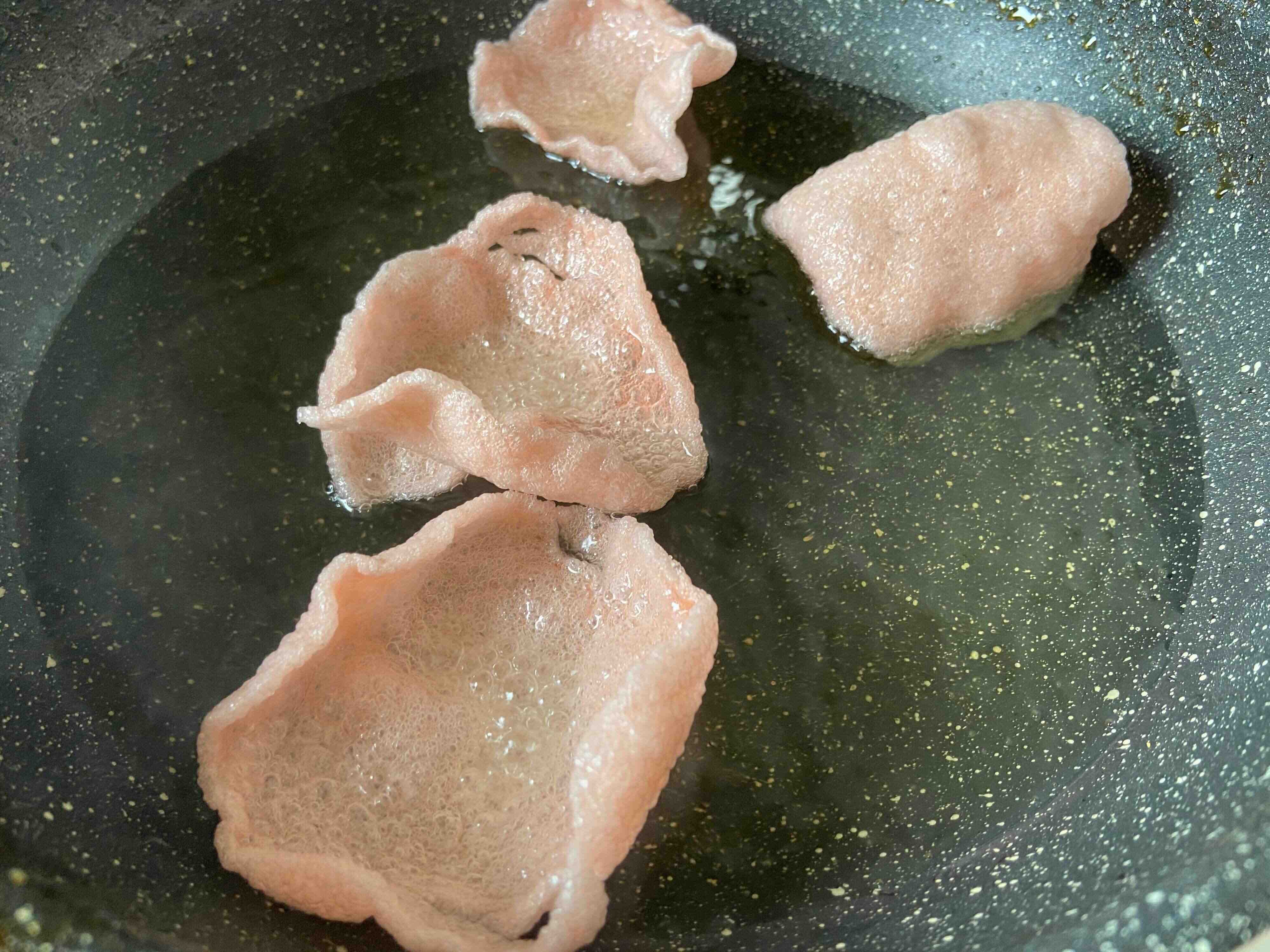 えびせんべいを入れてすぐ、2秒くらいで端からふくらみ始め…。