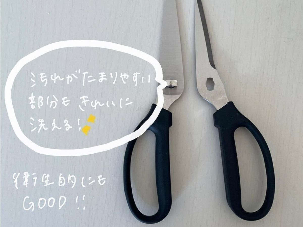 無印良品の『分解して洗えるキッチンばさみ』(1,490円)が機能性抜群だってこと知っていましたか?まず、名前の通り分解することが出来るので、お肉などを切った後もしっかりと隅々まで洗うことが出来るのでとても衛生的。それにプラスして切れ味が抜群です!刃が細かい波刃加工になっているので、お肉はもちろんカニの甲羅だって簡単に切れちゃいます。