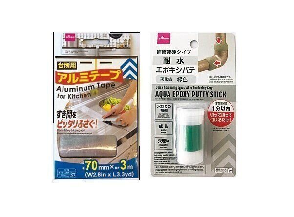 「台所用アルミテープ」(幅70mm×長さ約3m)、「補修速硬タイプ 耐水 エポキシパテ」