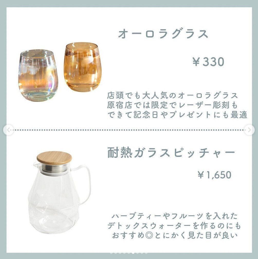 光を反射するキラキラカットがとってもかわいい「耐熱ガラスピッチャー」。ハーブティーを入れるもよし、フルーツ入りのトニックウォーターを入れるもよし。とにかく映えます!耐熱なので熱湯も使えますし、本体は食洗機にも対応しています。オーロラグラスとセットで使ってもいいですね。「それどこの?」と聞かれること間違いなし!1,650円です。