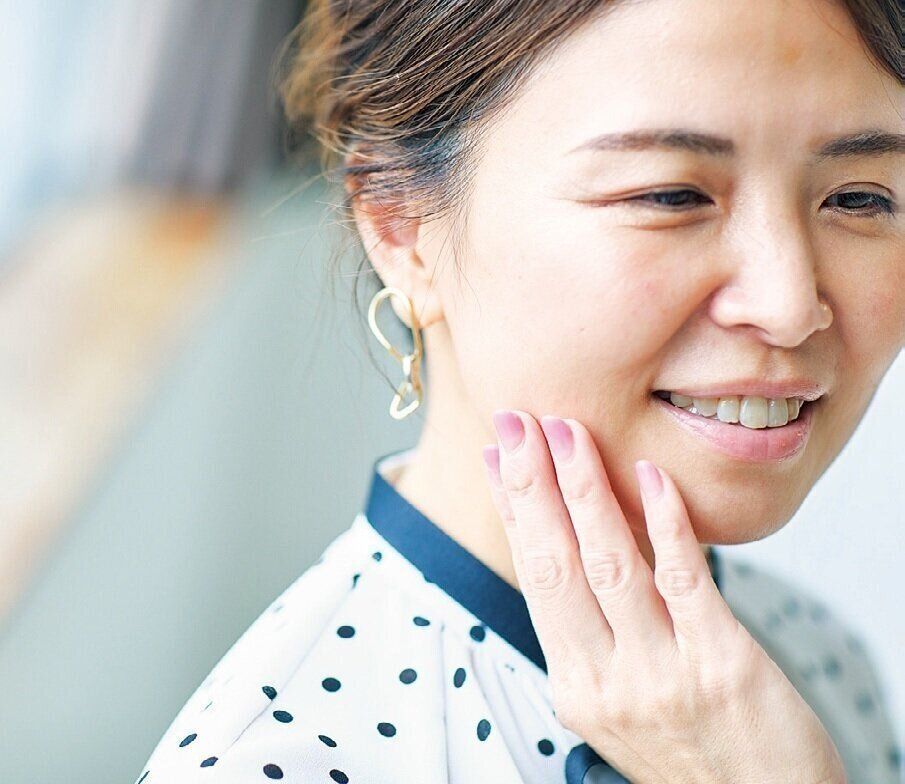 「フェムゾーンのケアが顔や全身の潤いアップにもつながっていると思う」と高林さん。ノーファンデでチークのみという高林さんの肌は40代とは思えないほどプルプル。