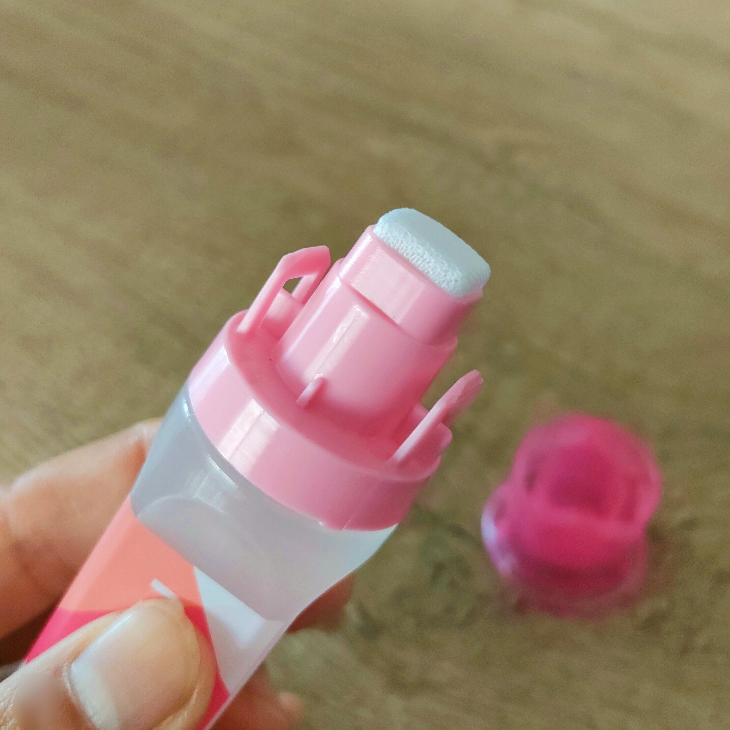 フタを取り外すと、液体のりが出てくる先端が現れます。最初に何度か強めに本体を押して、のりを先端になじませておく必要があります。