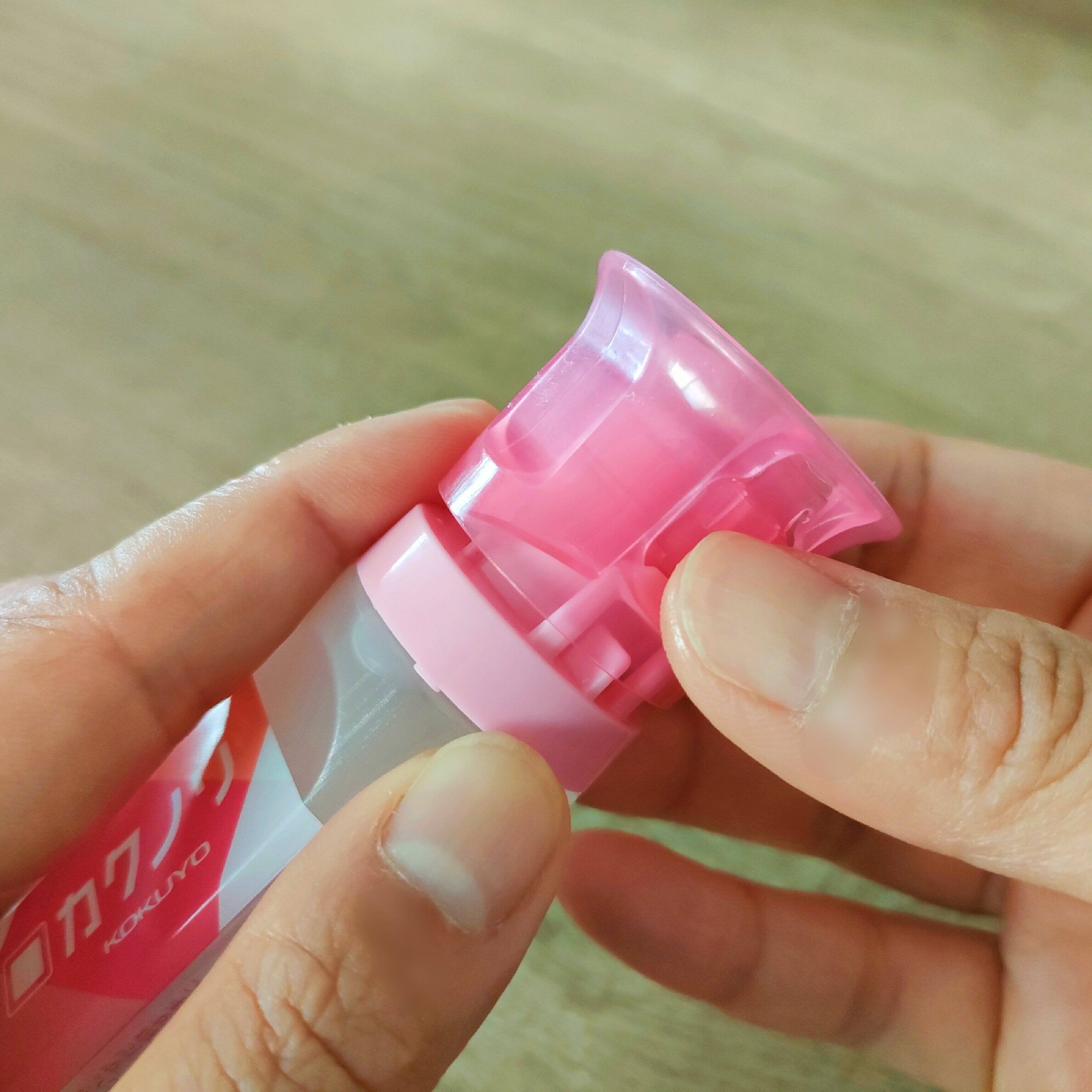 フタはワンタッチ式で両サイドのボタンを押すとカチッと開きました。くるくる回すタイプのフタは、中にのりの塊が詰まってしまうこともあり、使いづらいなぁと思っていたので、こちらはそんな心配もありません!