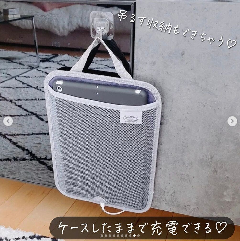 仕事や学校で毎日タブレットを持ち歩くかたにぴったりなアイテム。必要最小限の機能でとても使えるタブレットケースです。持ち手がついている方をリュックやランドセルの上側にして入れると、取り出すときにとてもスムーズ。またこのケースのいいところは、充電用の穴が開いていること!写真のようにケースに入れたまま充電できるのは楽でよいですね。