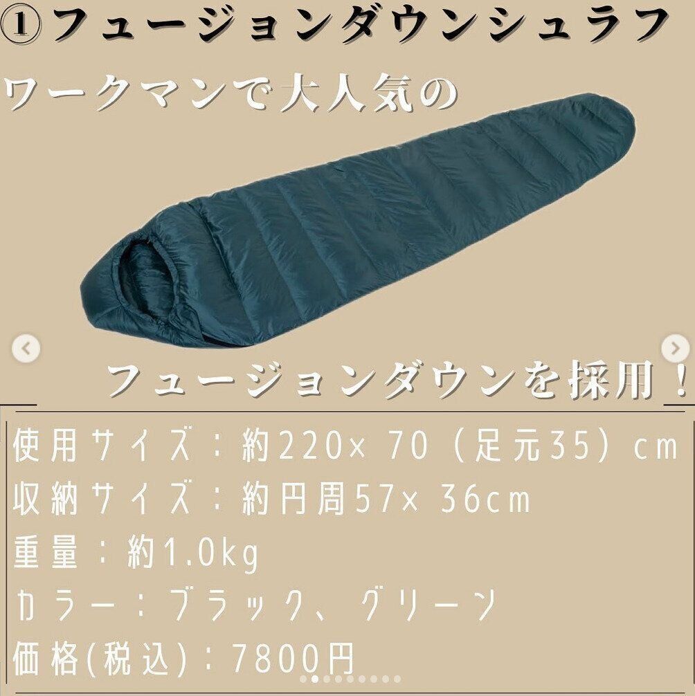 ワークマンの独自開発素材「フュージョンダウン」を使用したシュラフ。全身を覆うマミー型シュラフと高い保温性能でとにかく暖かく、車中泊や災害時などキャンプ以外でも使えるアイテムです。ディアマジックダイレクト加工で汚れに強いのもポイント。色はブラック・グリーンの2色です。