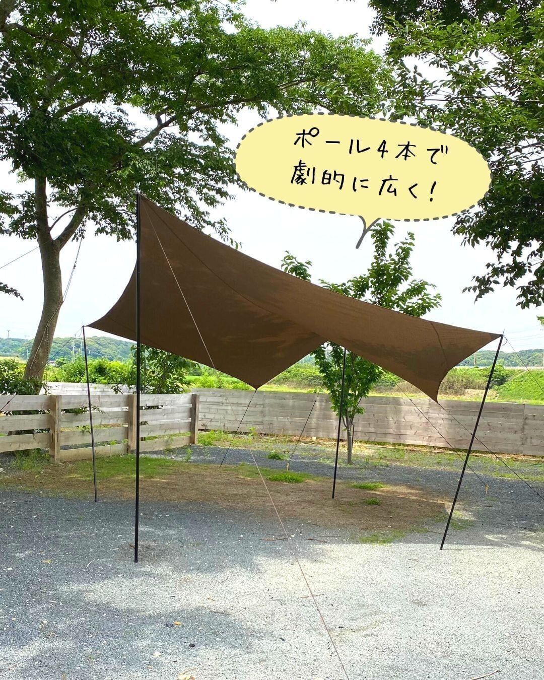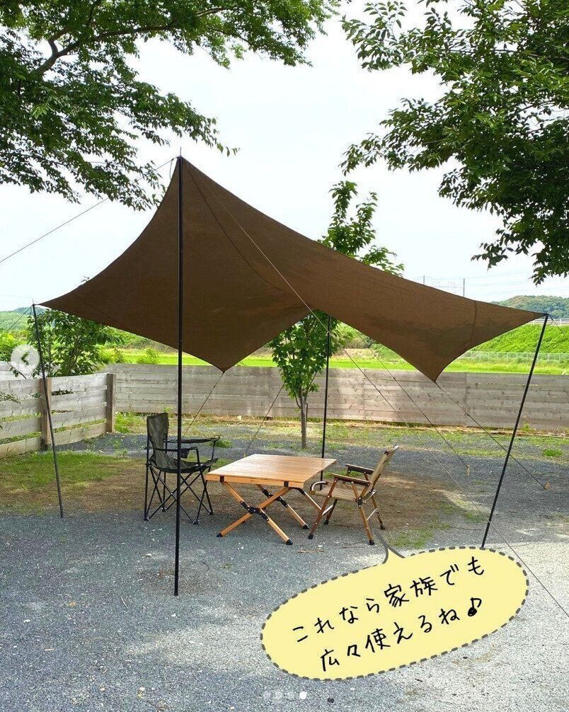 ポールを4本にすれば、スペースも広がり人数が増えても十分なスペースを確保できて便利!ワークマンの「TCミシックペンタゴンタープ」は、自然や他のキャンプギアになじみやすい落ち着いたブラウンなのも特徴的。ディアマジックダイレクトという生地を使用し、高撥水で汚れが落ちやすいのもポイントです!