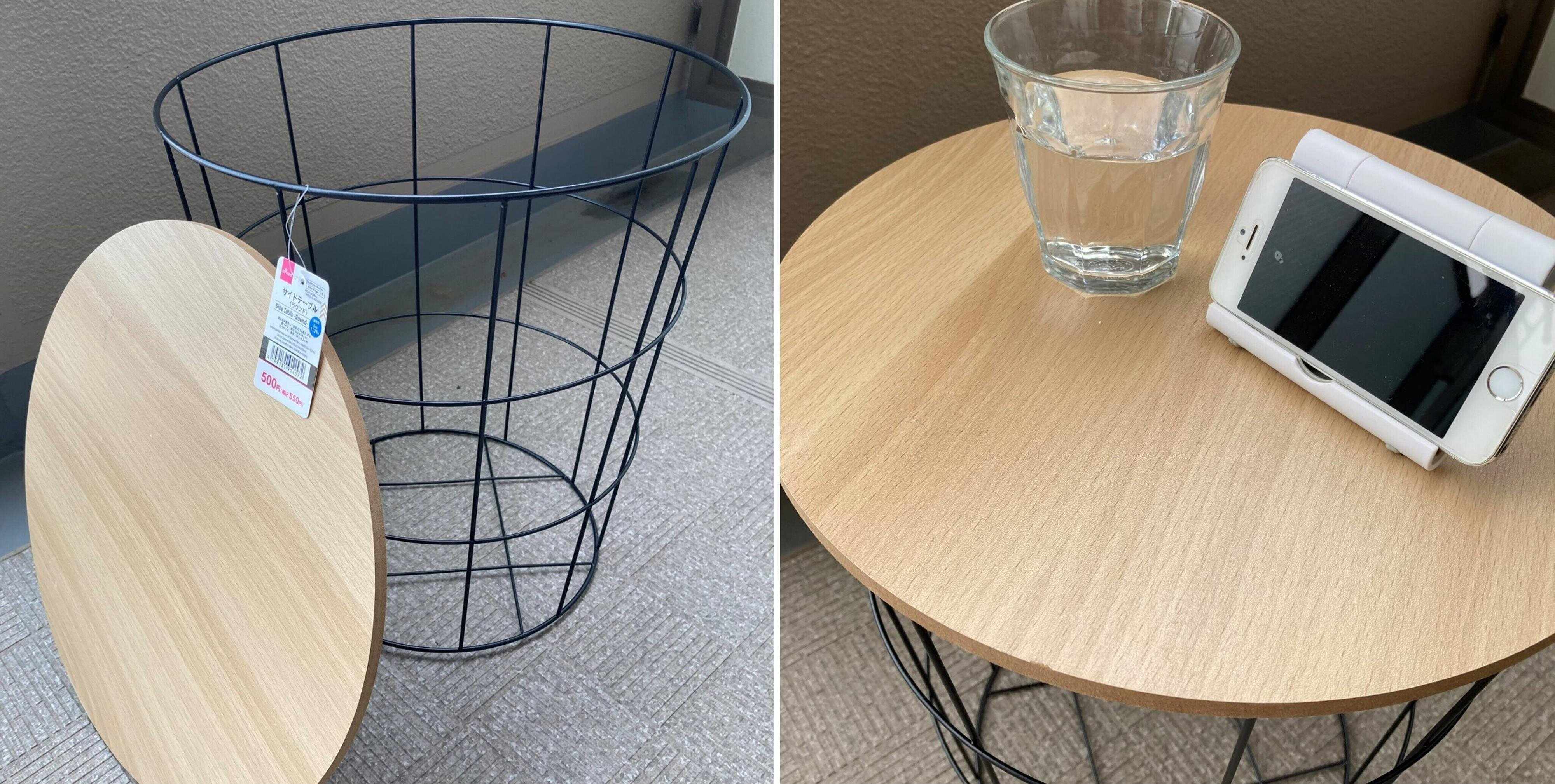 妻がとっても気に入って買ってきたサイドテーブル(550円)。サイズは「35.5×35.5×37cm」あり、ソファ横に置くとシックリきます。
