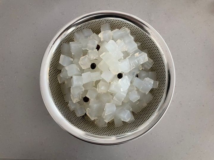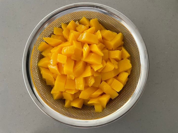 【1】 ボウルにゼラチン(7g)と水(35g)を入れ、ゼラチンをふやかしておきます。本品は固形分とシロップに分けておきます。