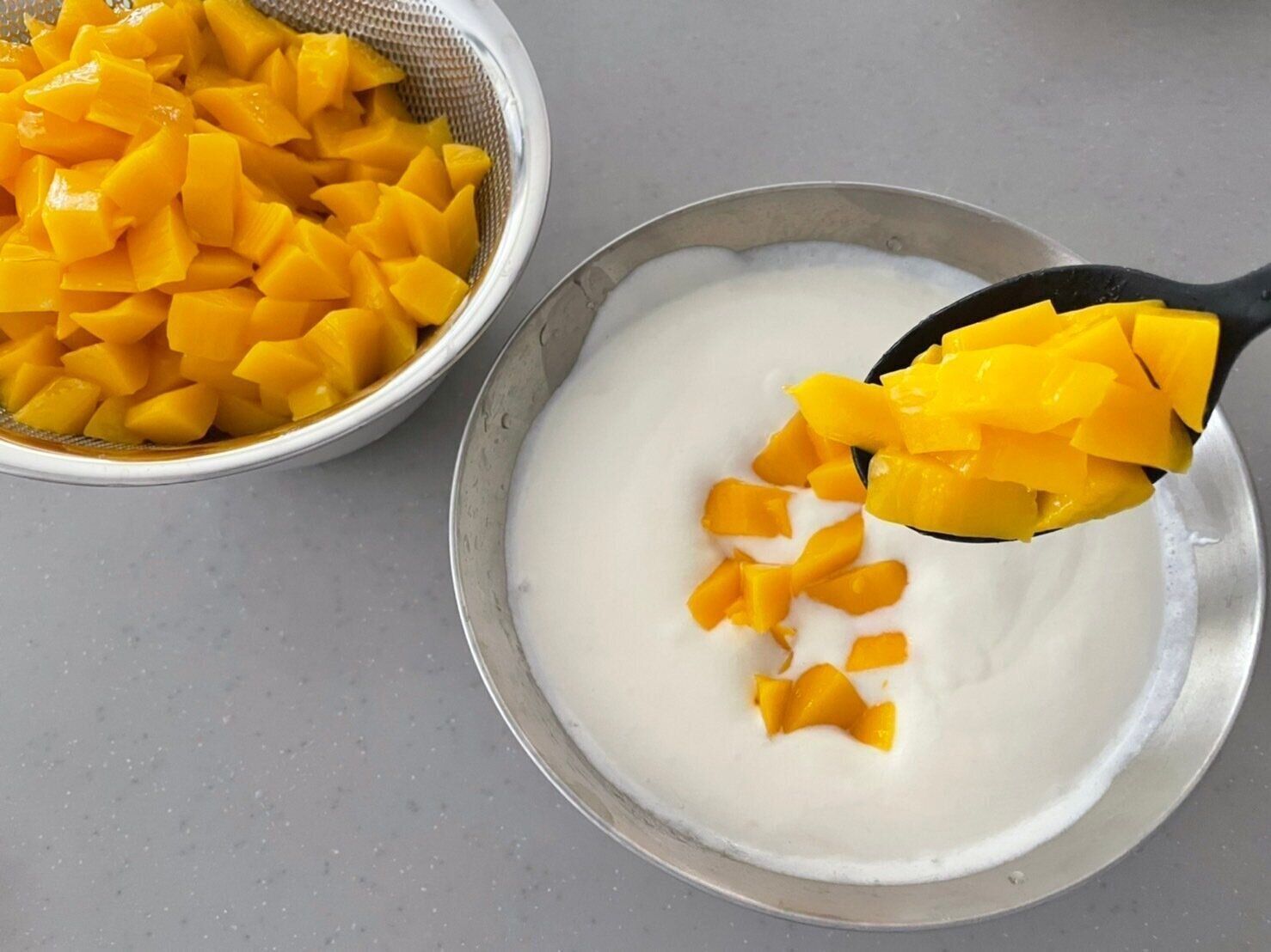 【2】 【1】にシロップを切った本品と混ぜます。お好みでフルーツも入れても良いです。