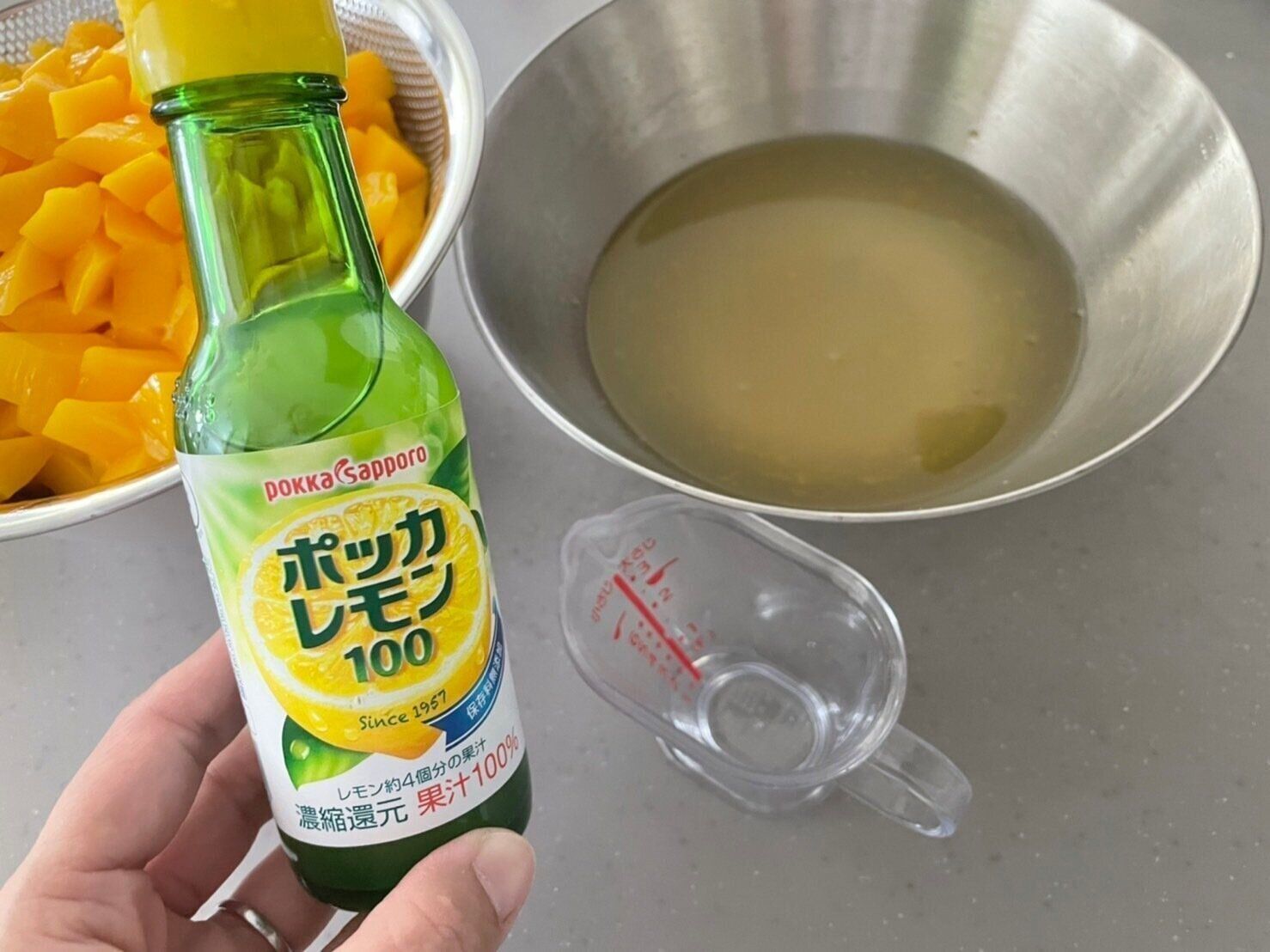 【2】 シロップにレモン汁(10ml)を入れ、混ぜ合わせます。