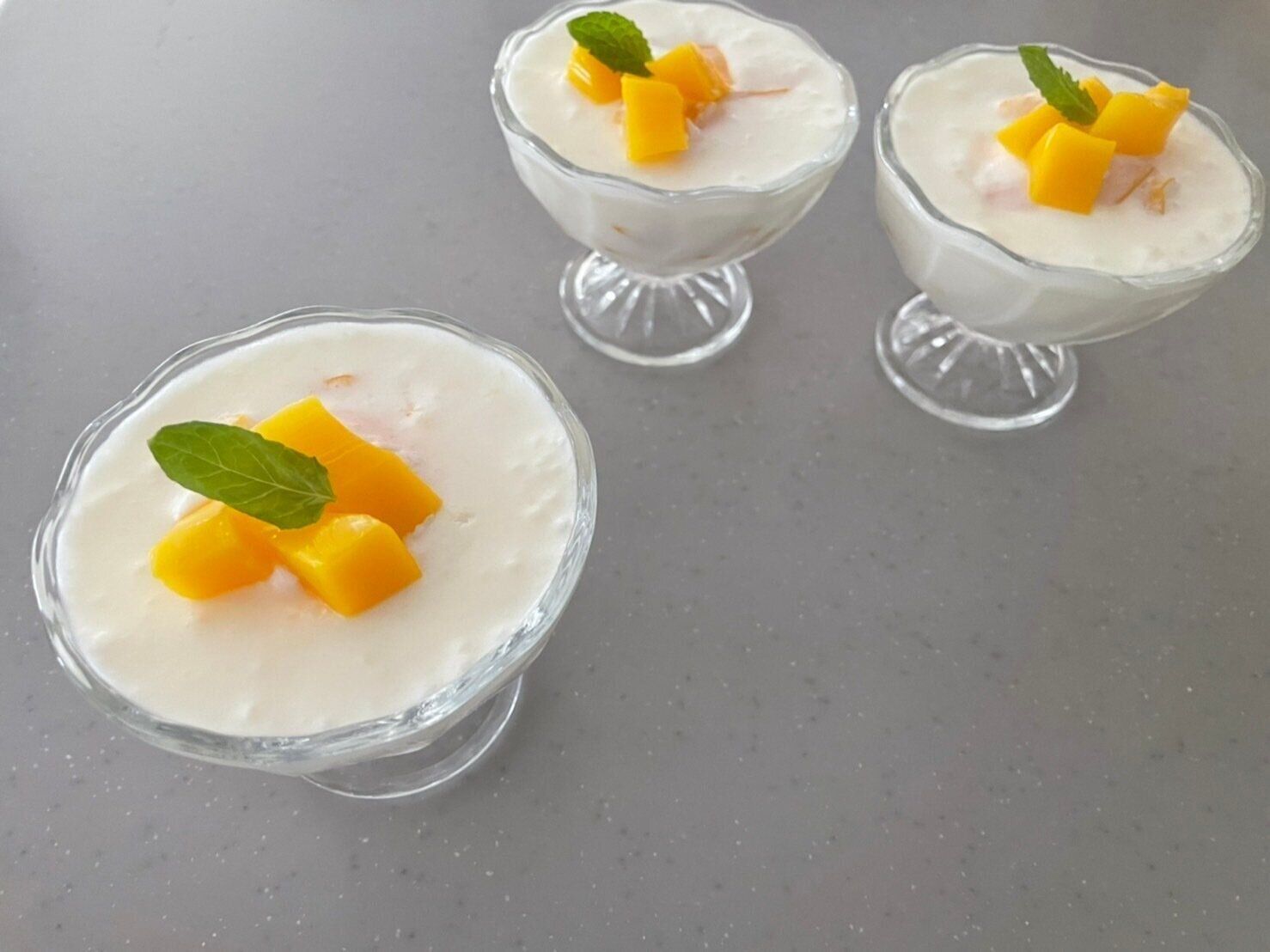 マンゴープリンはあっさりとした味ですが、弾力性があって食べ応えがありました。甘いババロアとの相性もバッチリ!ミントをのせて夏らしい涼しげな印象に。