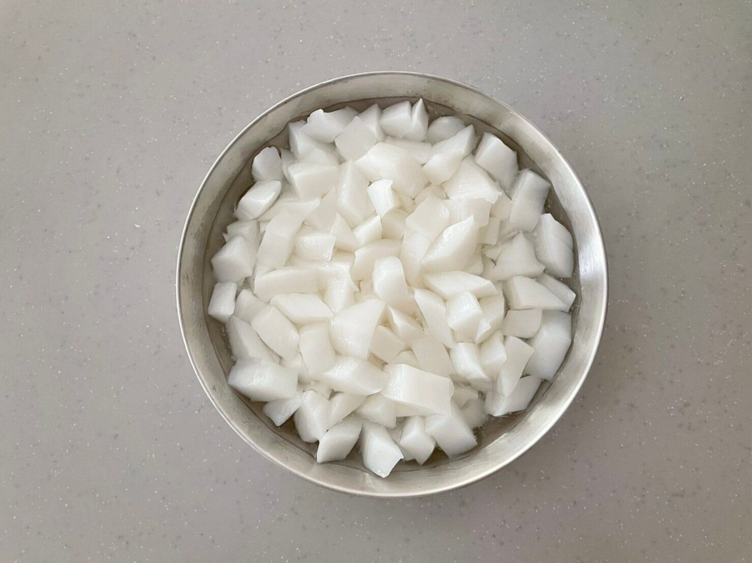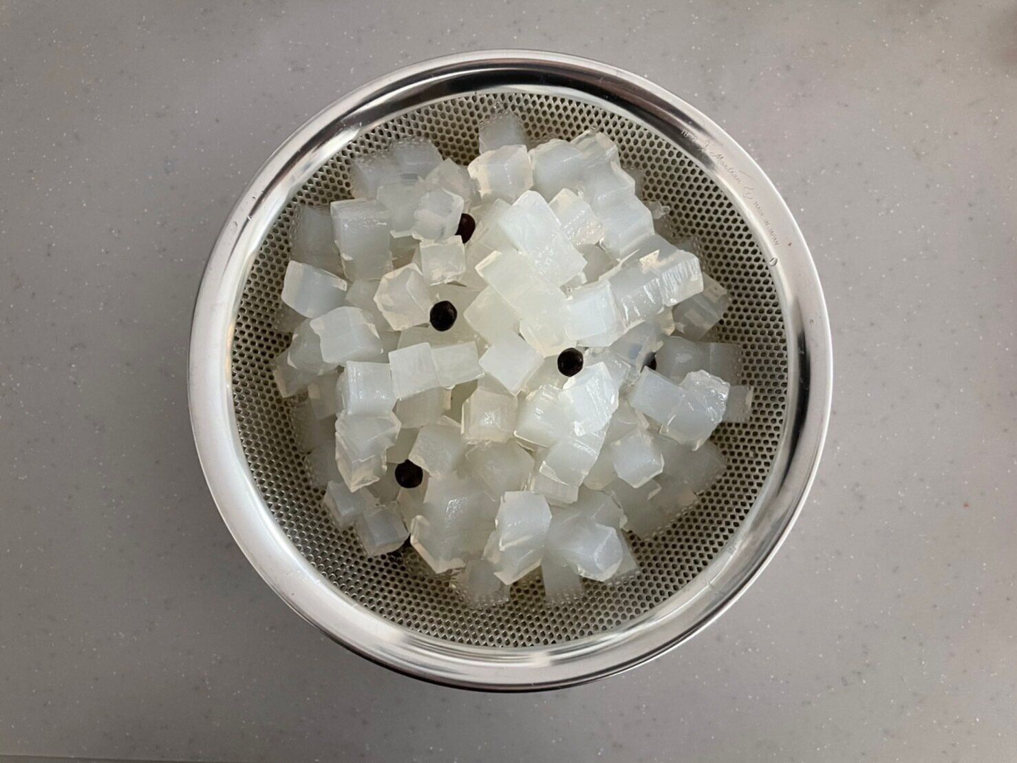 【5】 最後に本品(固形物)を混ぜ合わせて、器にうつして冷やし固めたらできあがりです。