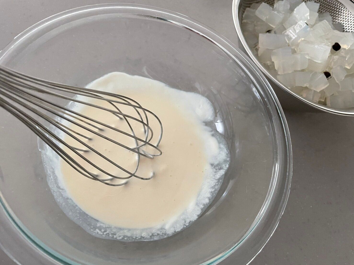 【3】 ふやかしておいたゼラチンをゆせんにかけて溶かし、【2】に混ぜ合わせます。