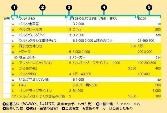 懸賞の応募記録は、エクセル表に入力。「記録するのが面倒にならないようにマークなどで簡略化。当選品をマーカー分けして、当たりやすい傾向をチェックします」。