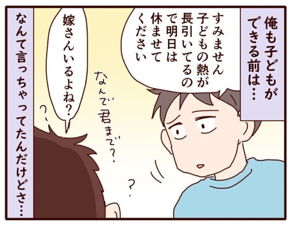 子どもの看病のために休みたいと伝える同僚に「なんで君まで?」と話していた過去を振り返ります。