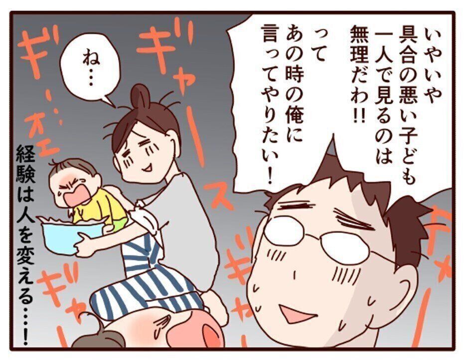 しかし、育児を経験した今は「具合の悪い子ども1人で見るのは無理」だと理解。まさに経験は人を変える例ですね。