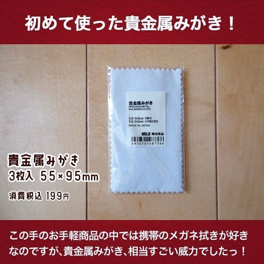 大切にしている貴金属類のお手入れはしていますか?頻繁に行うことではないので、数年放置して気がついた頃には色がくすんでしまっていたり…。心当たりのあるかたも多いのではないでしょうか。そんなかたにおススメしたいのが、無印良品の「貴金属みがき」3枚入り199円です。